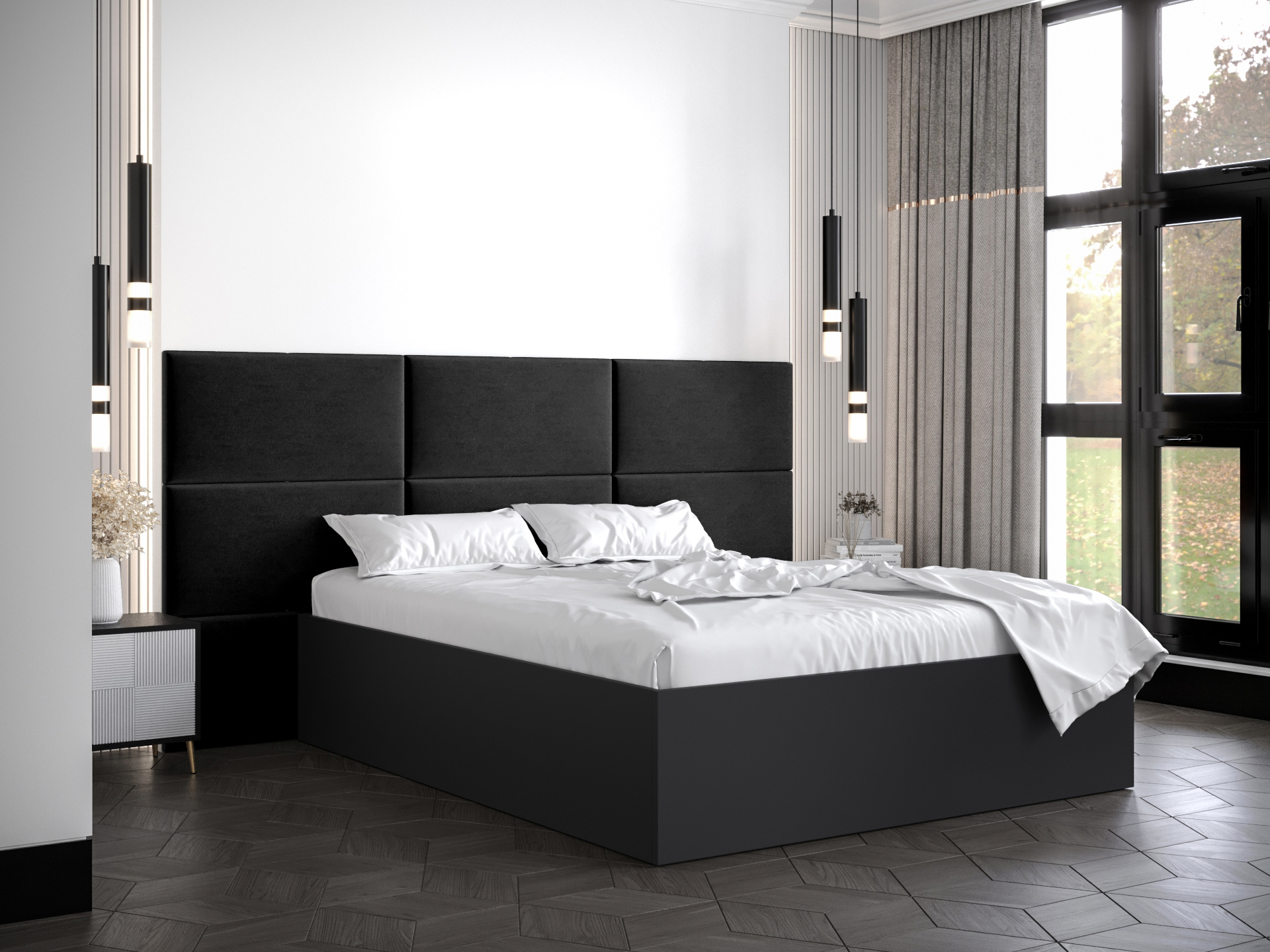 Pat matrimonial cu tăblie tapițată 160 cm Brittany 2 (Negru mat + Negru) (cu somieră)