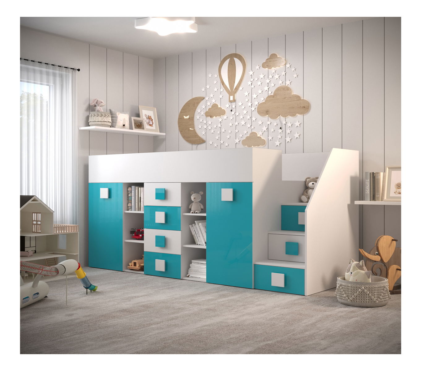 - Pat multifuncțional 90 cm Toreno 3 (Alb + alb lucios + turcoaz lucios) (D)