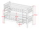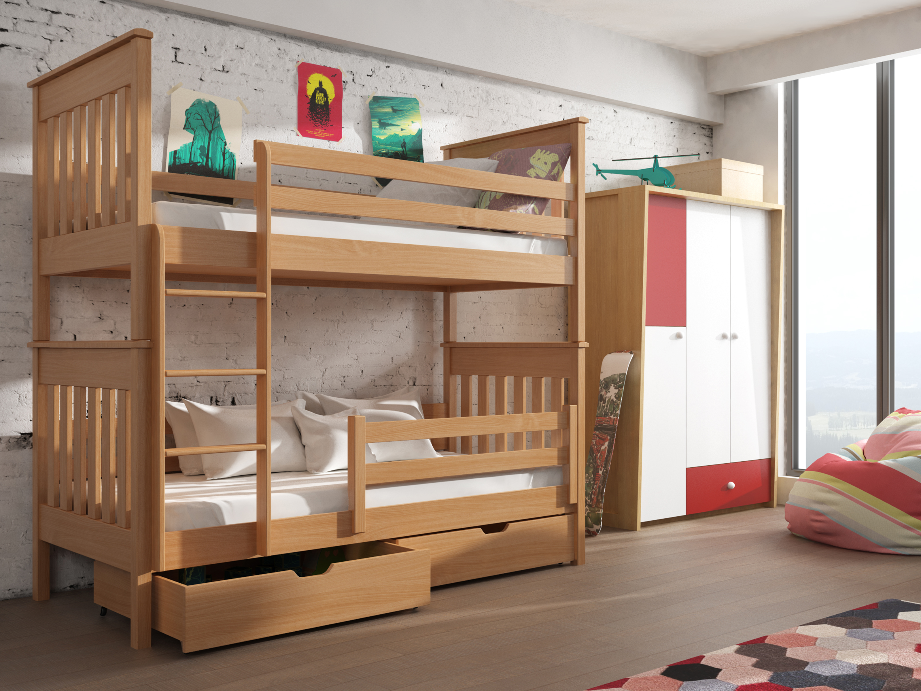 Pat supraetajat cu bare de protecție împotriva căderii în timpul somnului. Este potrivit pentru camera copiilor. Scara patului poate fi asamblată pe partea dorită, stânga sau dreapta. Conține spațiu de depozitare sub forma a două sertare cu roți cauciucate, pentru a proteja podeaua. Se livrează dezasamblat.