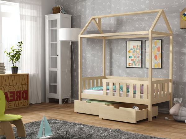 Pat pentru copii cu bară de protecție împotriva căderii. Este fabricat din lemn de pin, ideal pentru copiii care au probleme cu alergiile, deoarece nu absoarbe atât de mult praful precum alte tipuri de lemn.