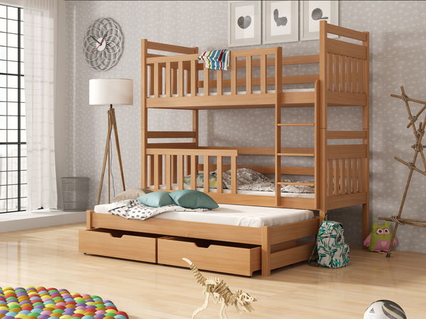 Pat supraetajat Kristy potrivit pentru camere de copii mai mici, confortabil pentru trei copii. Înălțimea patului superior de la sol este de 135 cm, înălțimea patului de mijloc de la sol este de 50 cm. Suprafața de dormit a spațiului inferior este cu 10 cm mai mică decât suprafața paturilor superioare. Patul superioar și mijlociu au bare de protecție pentru copii. Patul supraetajat Kristy este fabricat din lemn de pin. Patul conține deasemenea, și spațiu practic de depozitare sub forma a două sertare.