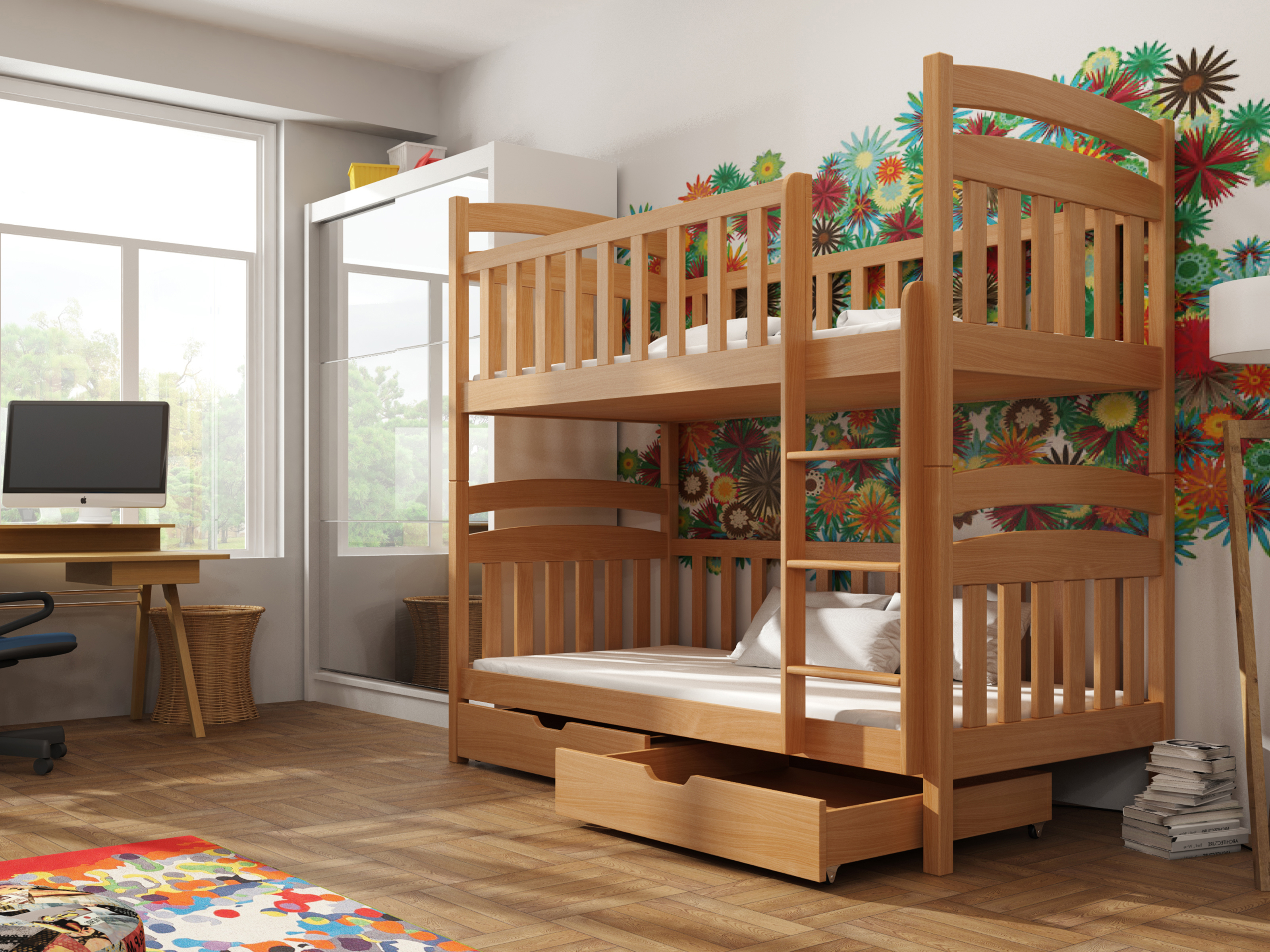 Pat supraetajat cu bare de protecție împotriva căderii în timpul somnului. Este potrivit pentru camera copiilor. Scara patului poate fi asamblată pe partea dorită, stânga sau dreapta. Conține spațiu de depozitare sub forma a două sertare cu roți cauciucate, pentru a proteja podeaua. Se livrează dezasamblat.