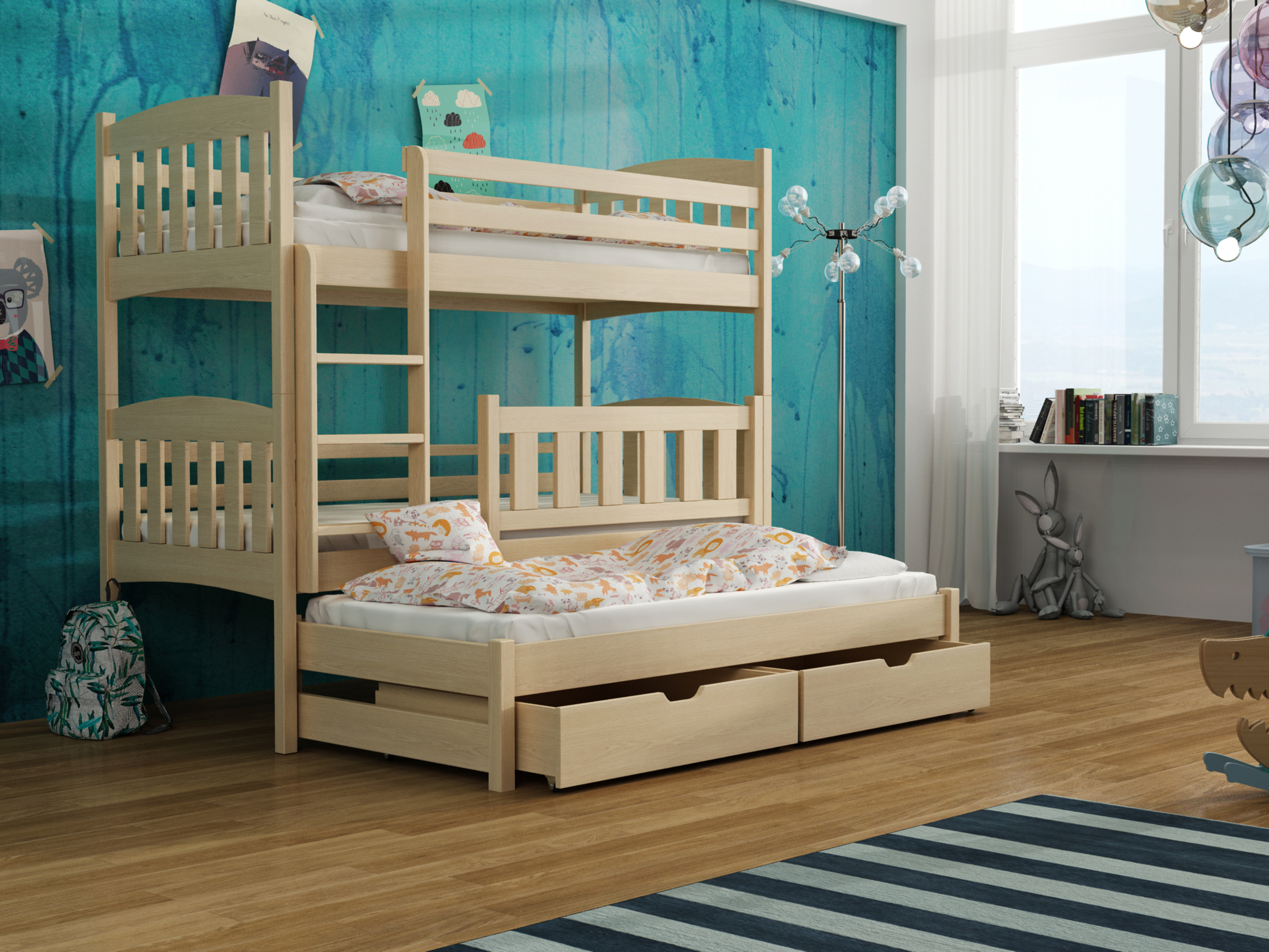 Pat supraetajat cu bare de protecție împotriva căderii în timpul somnului. Este potrivit pentru camera copiilor. Scara patului poate fi asamblată pe partea dorită, stânga sau dreapta. Conține spațiu de depozitare sub forma a două sertare cu roți cauciucate, pentru a proteja podeaua. Se livrează dezasamblat.