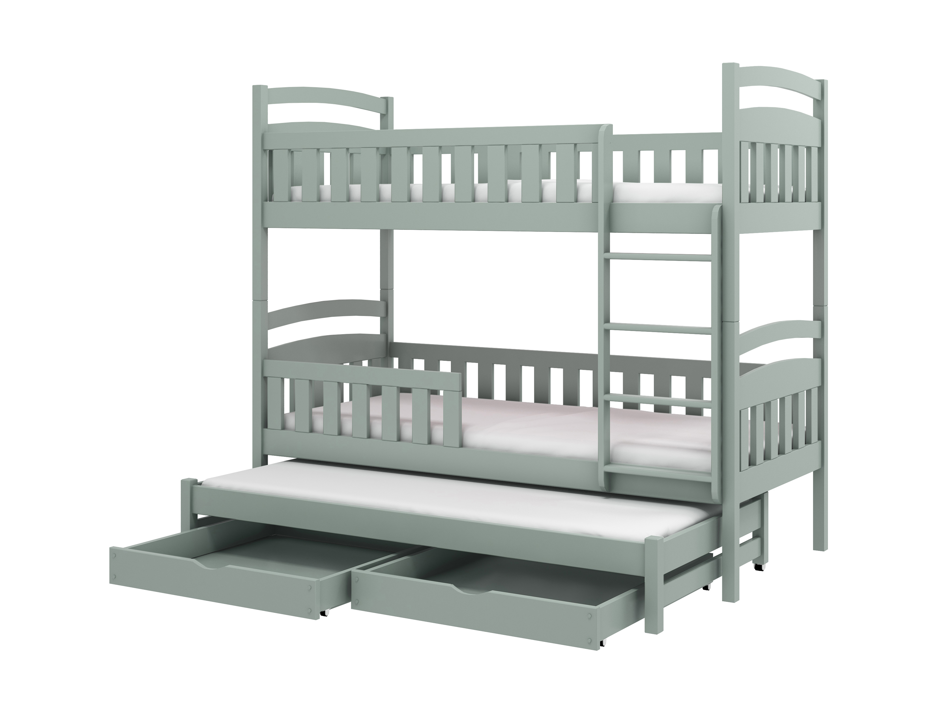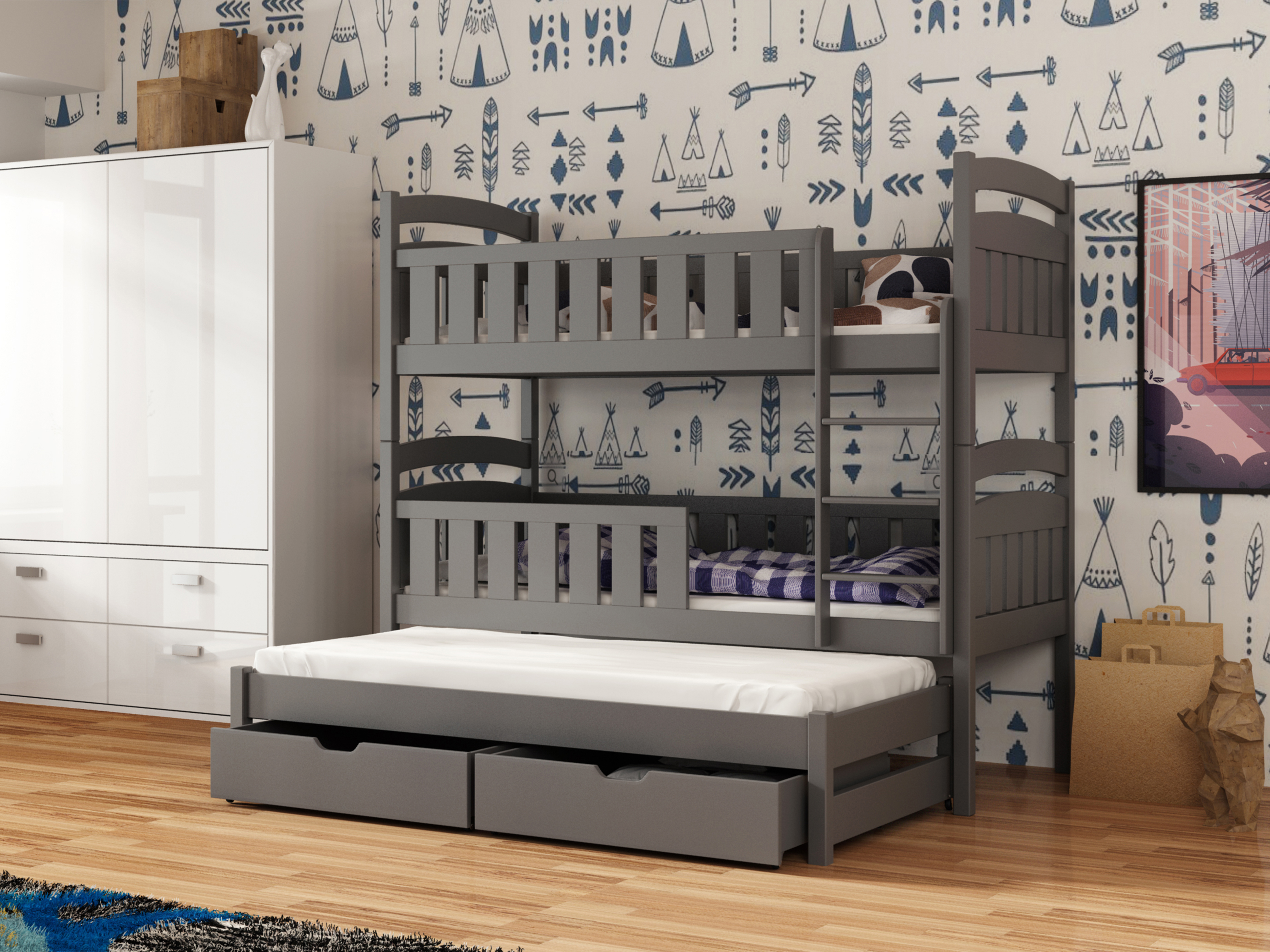 Pat supraetajat Annett este potrivit pentru camera de copii mai mici. Înălțimea de la sol la patul superior este de 135 cm, înălțimea de la sol la patul inferior este de 50 cm, iar înălțimea de la sol la al treilea pat este de 35 cm. Patul este realizat din scânduri de lemn. Spațiul de depozitare este oferit sub formă a două sertare.