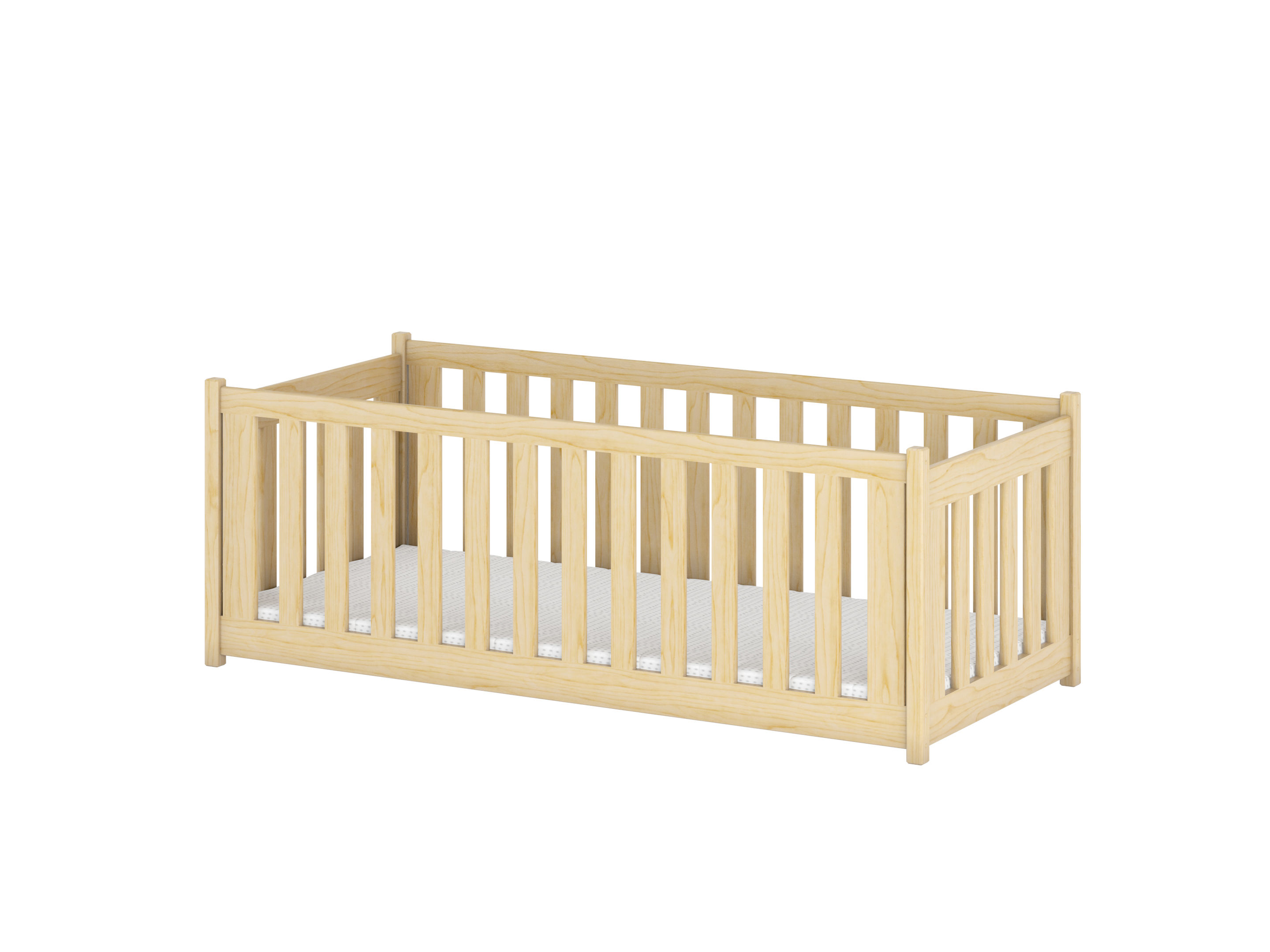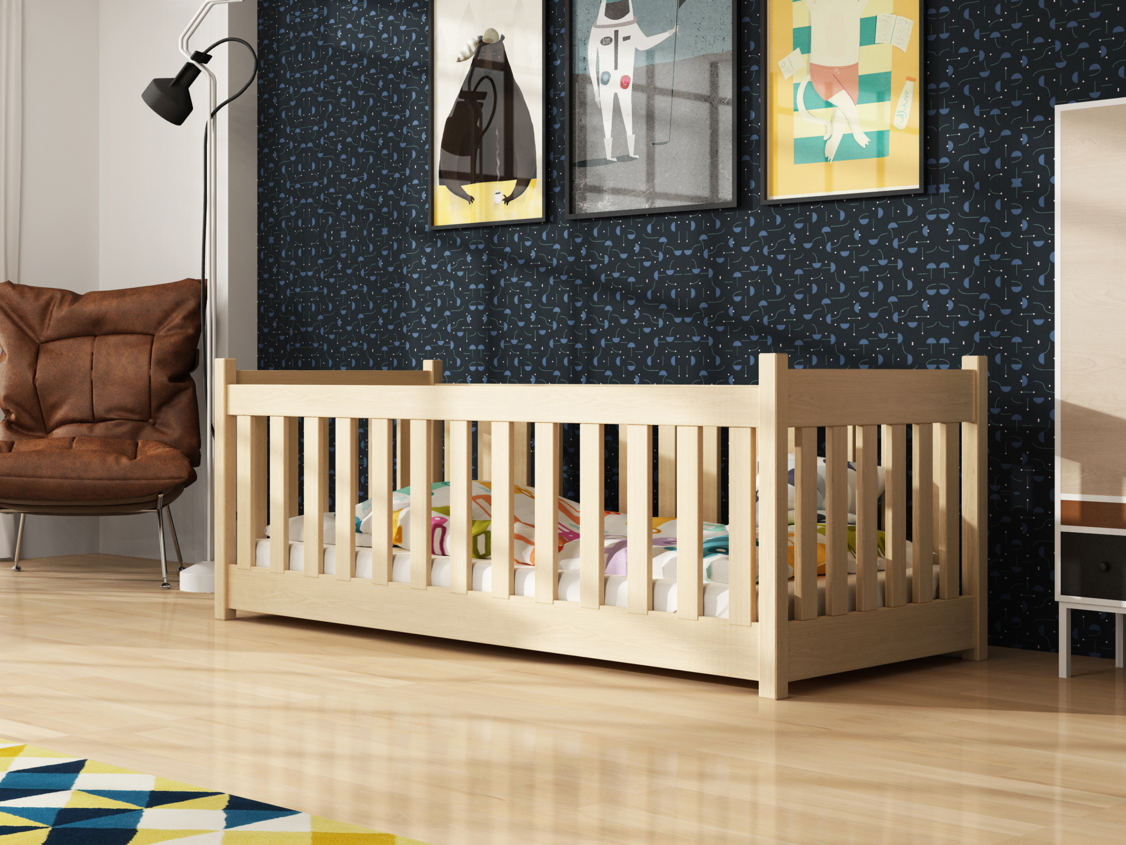 Pat pentru copii cu bară de protecție împotriva căderii. Este fabricat din lemn de pin, ideal pentru copiii care au probleme cu alergiile, deoarece nu absoarbe atât de mult praful precum alte tipuri de lemn.