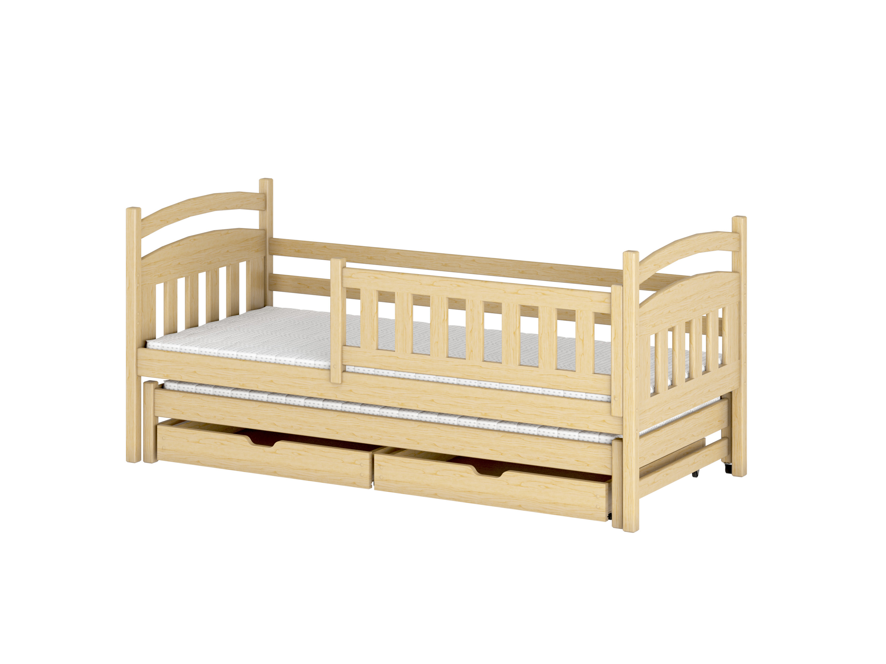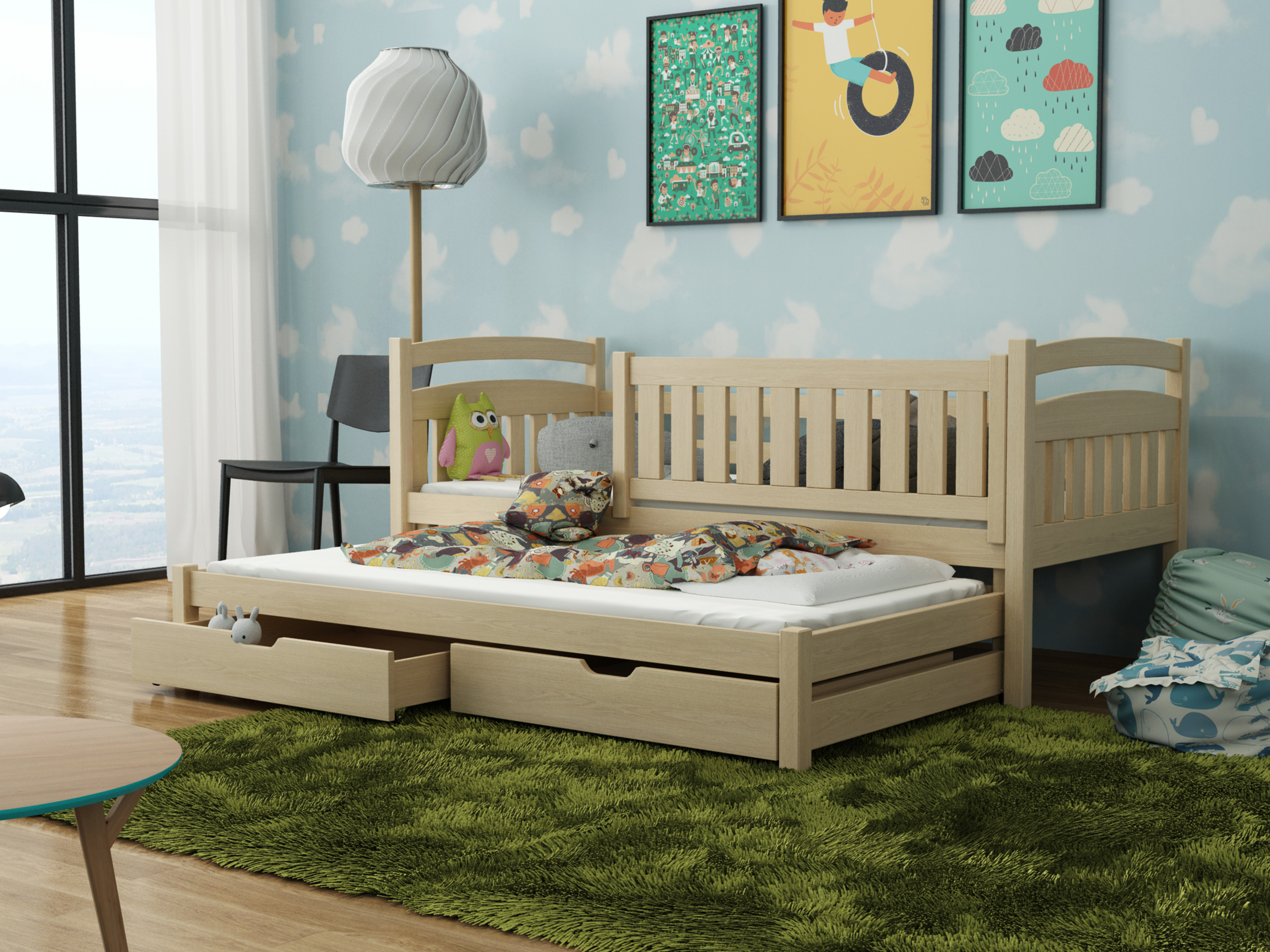 Pat extensibil pentru 2 persoane, potrivit pentru doi copii. Patul superior este recomandat pentru copii mai mici datorită barierelor de protecție. Bariera poate fi îndepărtată oricând. Patul inferior este glisant. Este fabricat din lemn de pin, tratat cu lac, oferind toate certificatele necesare. Patul conține și spațiu de depozitare sub formă de sertare pe roți din cauciuc, care nu deteriorează podeaua.