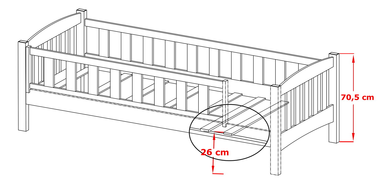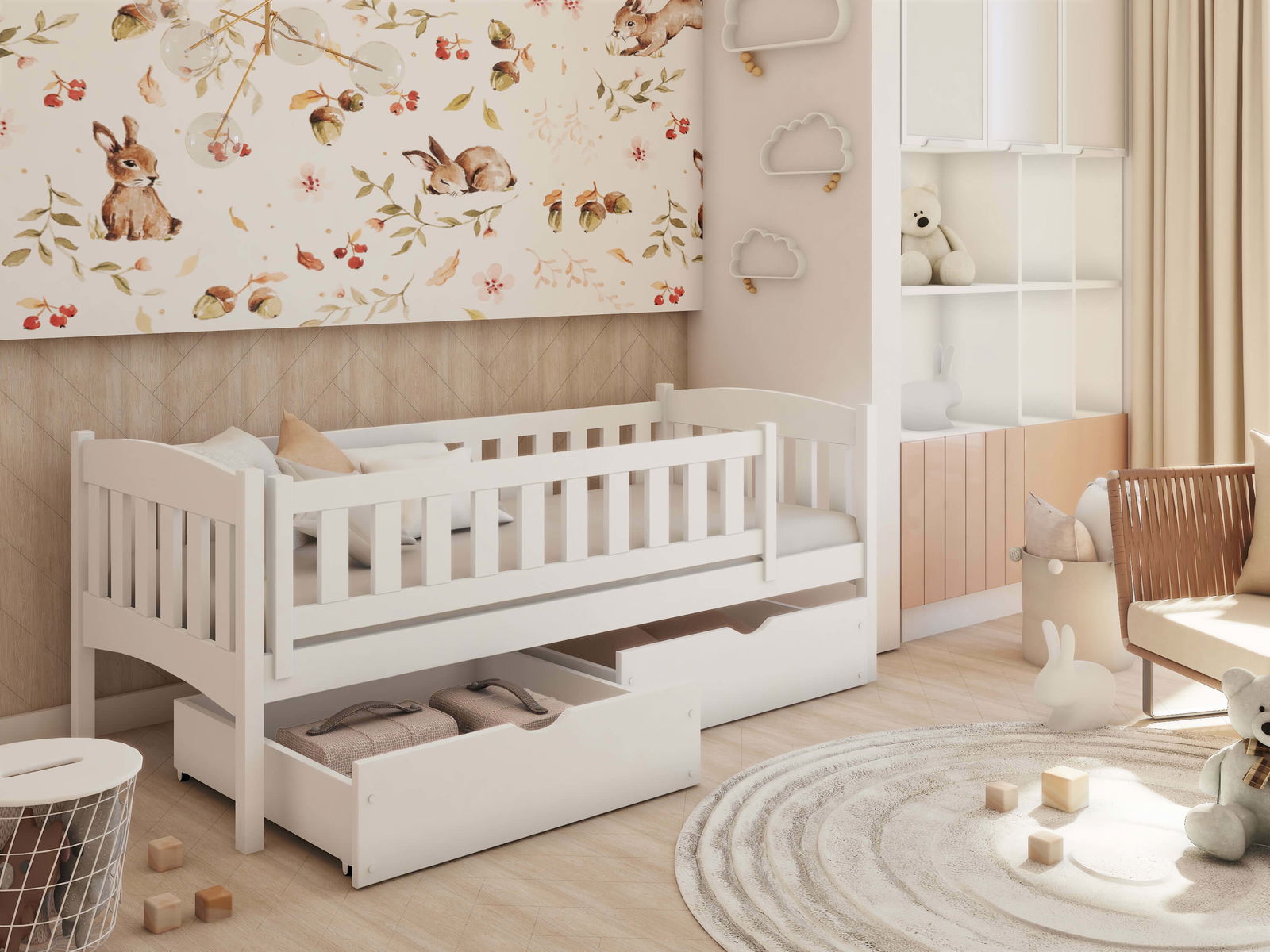 Pat de o persoană pentru copii, cu bare de protecție împotriva căderii. Este fabricat din plăci de lemn. Conține și spațiu de depozitare sub formă a două sertare cu roți cauciucate.