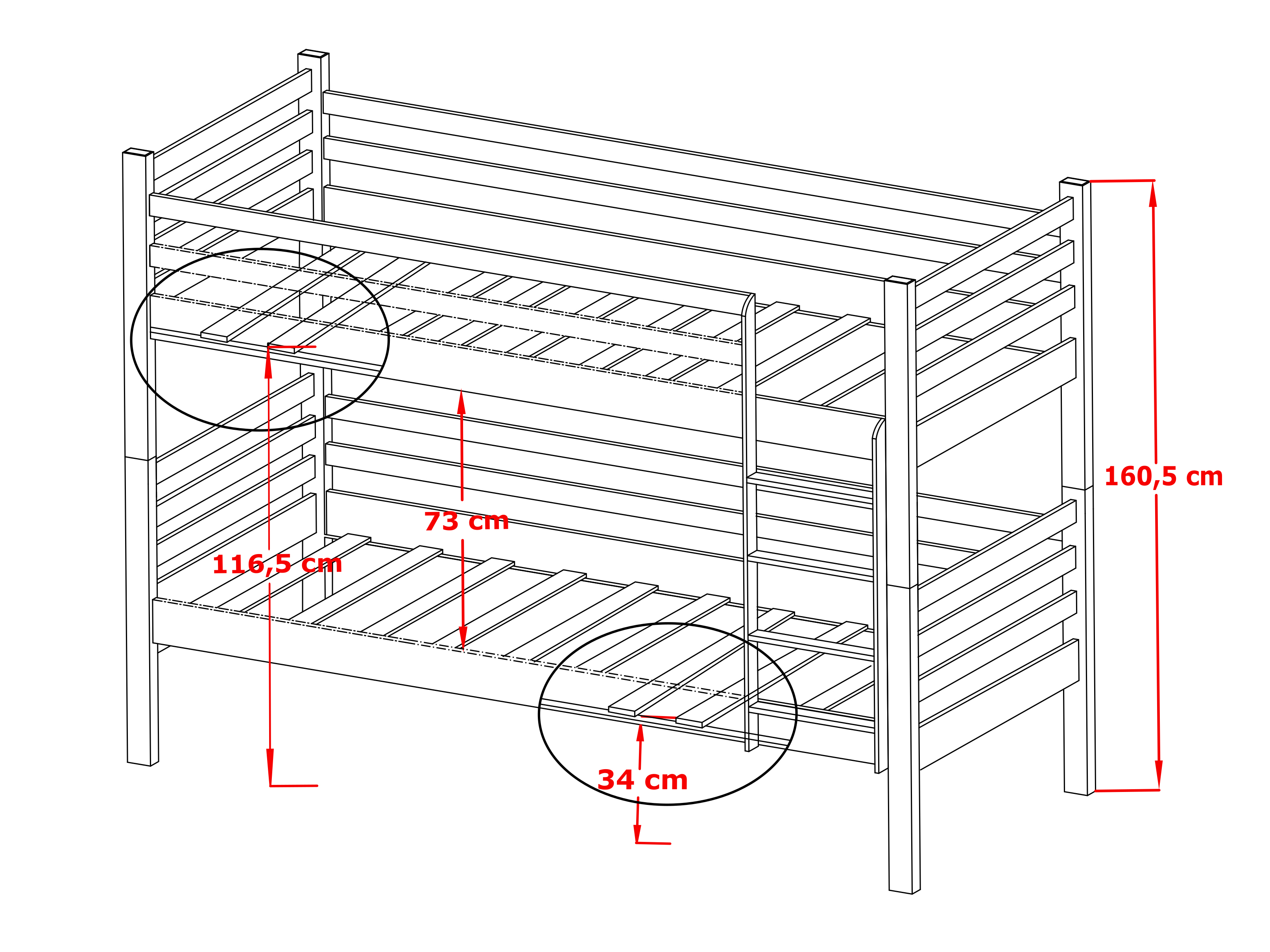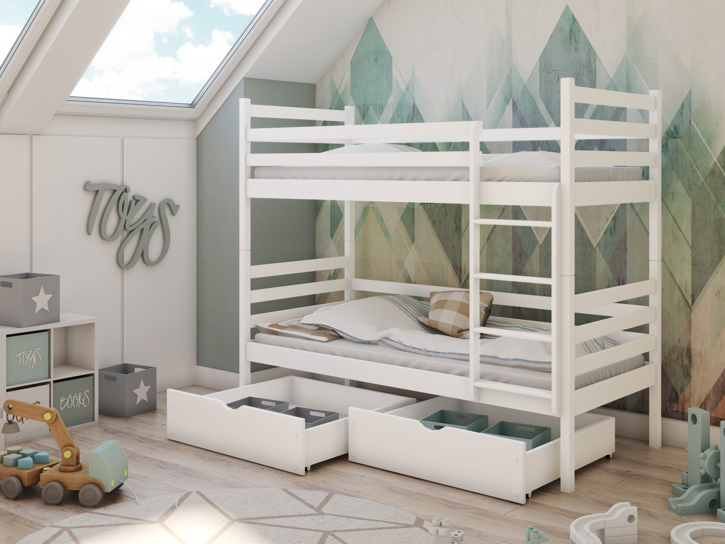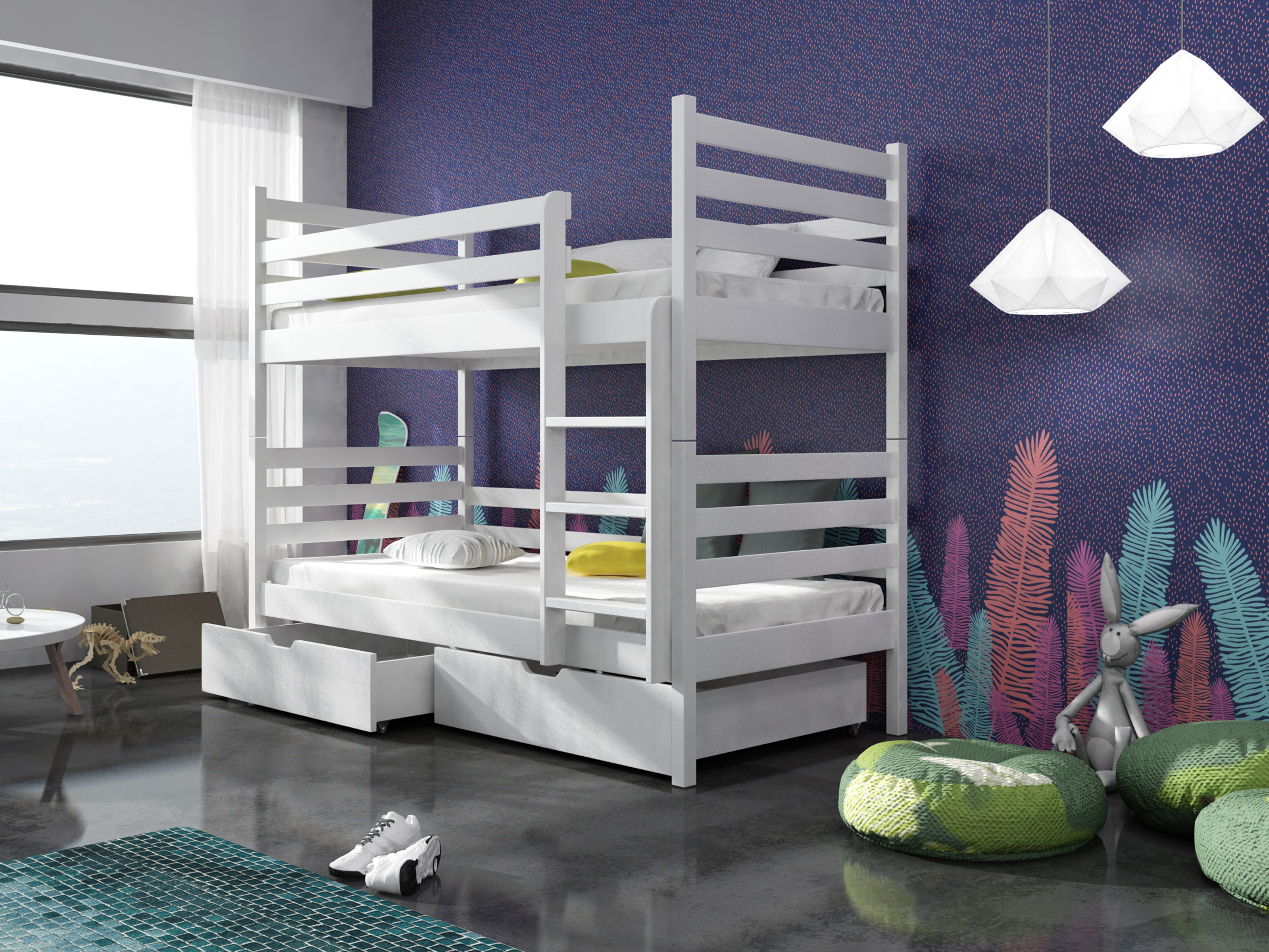 Pat supraetajat Nubia care va face bucurie copiilor voștrii. Este potrivit pentru camere mai mici. Paturile superioare și inferioare conțin bare de protecție, astfel protejează copiii îm timpul somnului de la căderea din pat. Scara patului poate fi asamblată pe partea dorită. Nu poate lipsi nici spațiu de depozitare, sub formă a două sertare cu roți din cauciuc.
