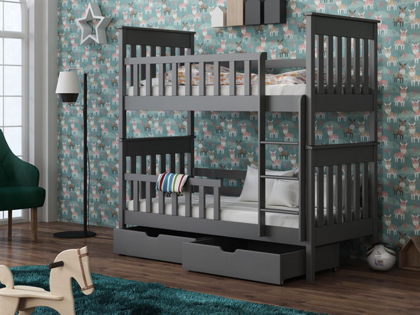Pat supraetajat cu bare de protecție împotriva căderii în timpul somnului. Este potrivit pentru camera copiilor. Scara patului poate fi asamblată pe partea dorită, stânga sau dreapta. Conține spațiu de depozitare sub forma a două sertare cu roți cauciucate, pentru a proteja podeaua. Se livrează dezasamblat.