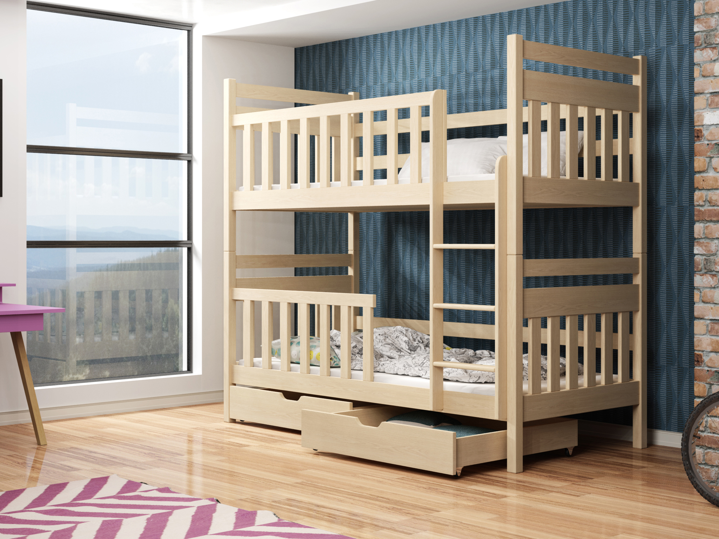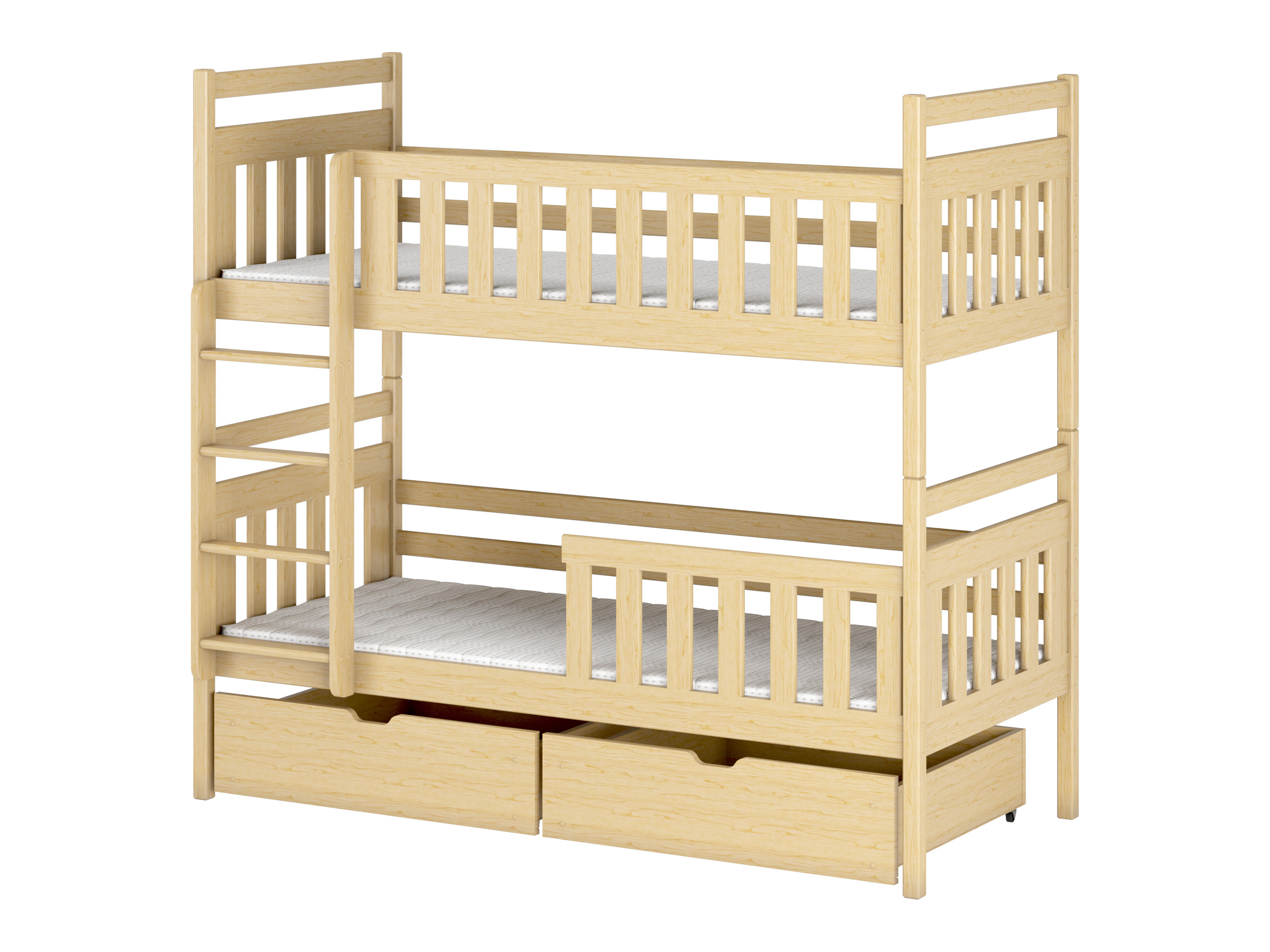 Pat supraetajat, din lemn de pin, cu bare de protecție împotriva căderii în timpul somnului. Este potrivit pentru camera copiilor. Scara patului poate fi asamblată pe partea dorită, stânga sau dreapta. Conține spațiu de depozitare sub forma a două sertare cu roți cauciucate, pentru a proteja podeaua. Se livrează dezasamblat.
