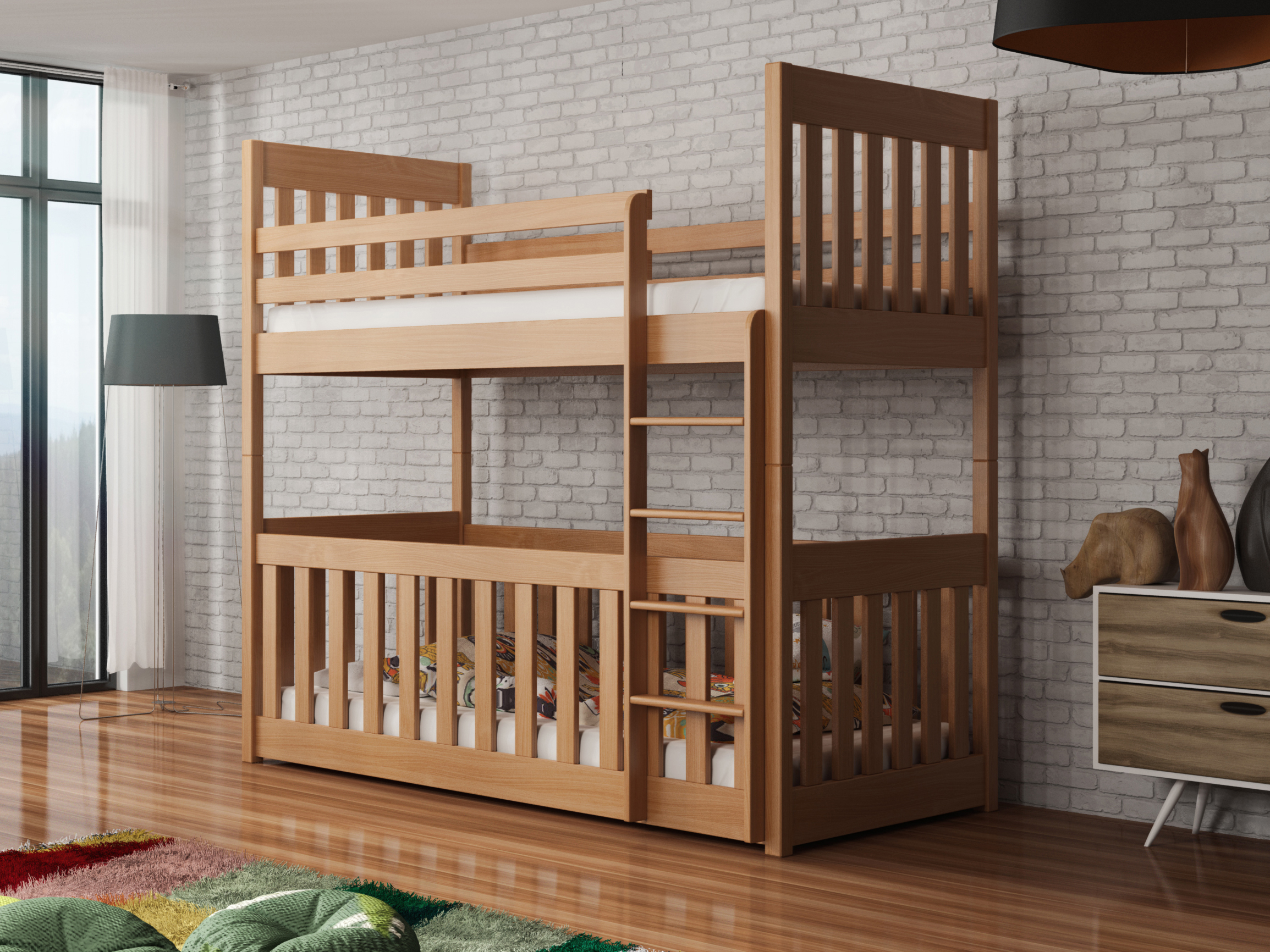 Pat supraetajat cu bare de protecție împotriva căderii în timpul somnului. Este potrivit pentru camera copiilor. Scara patului poate fi asamblată pe partea dorită, stânga sau dreapta. Conține spațiu de depozitare sub forma a două sertare cu roți cauciucate, pentru a proteja podeaua. Se livrează dezasamblat.