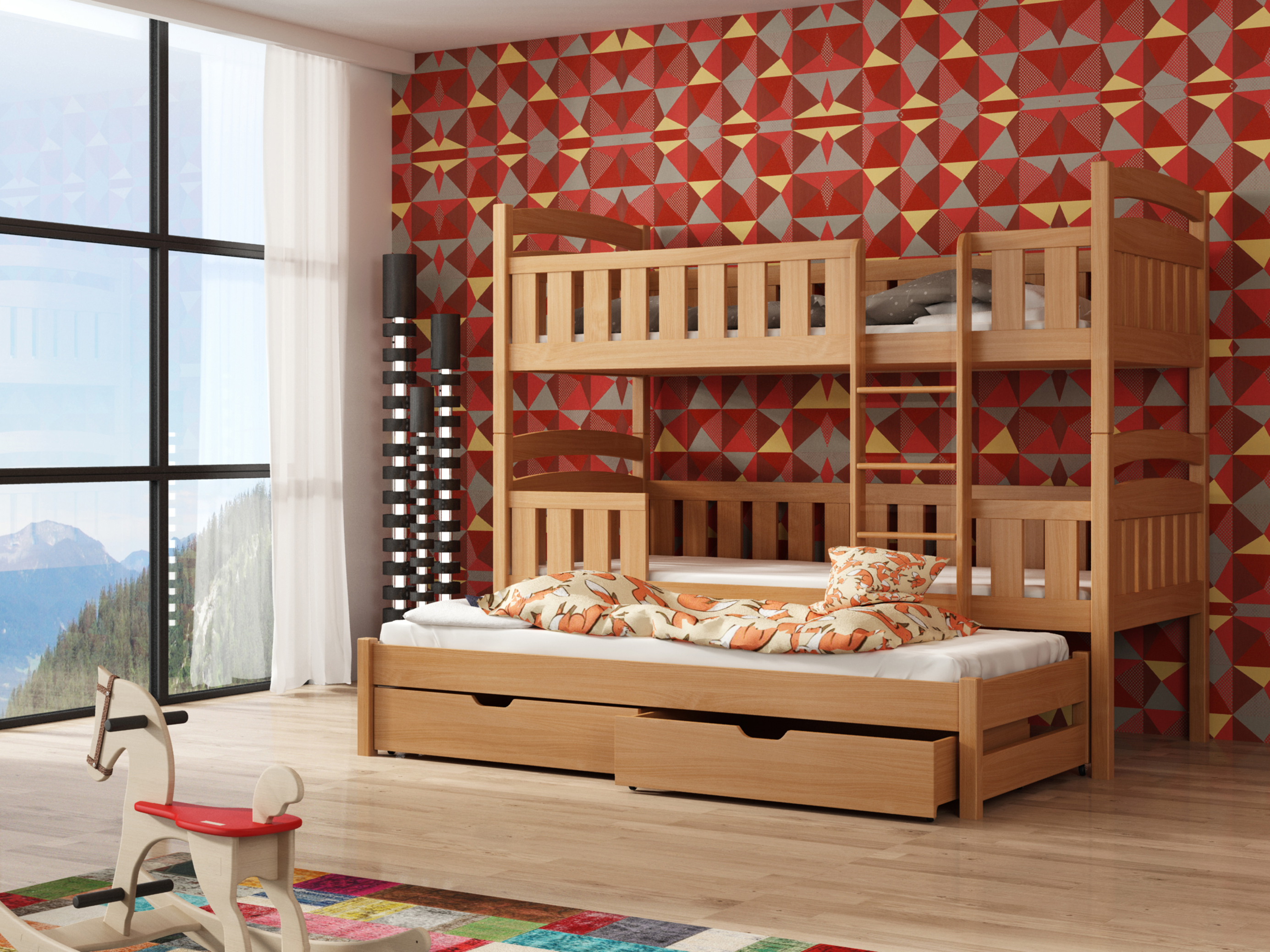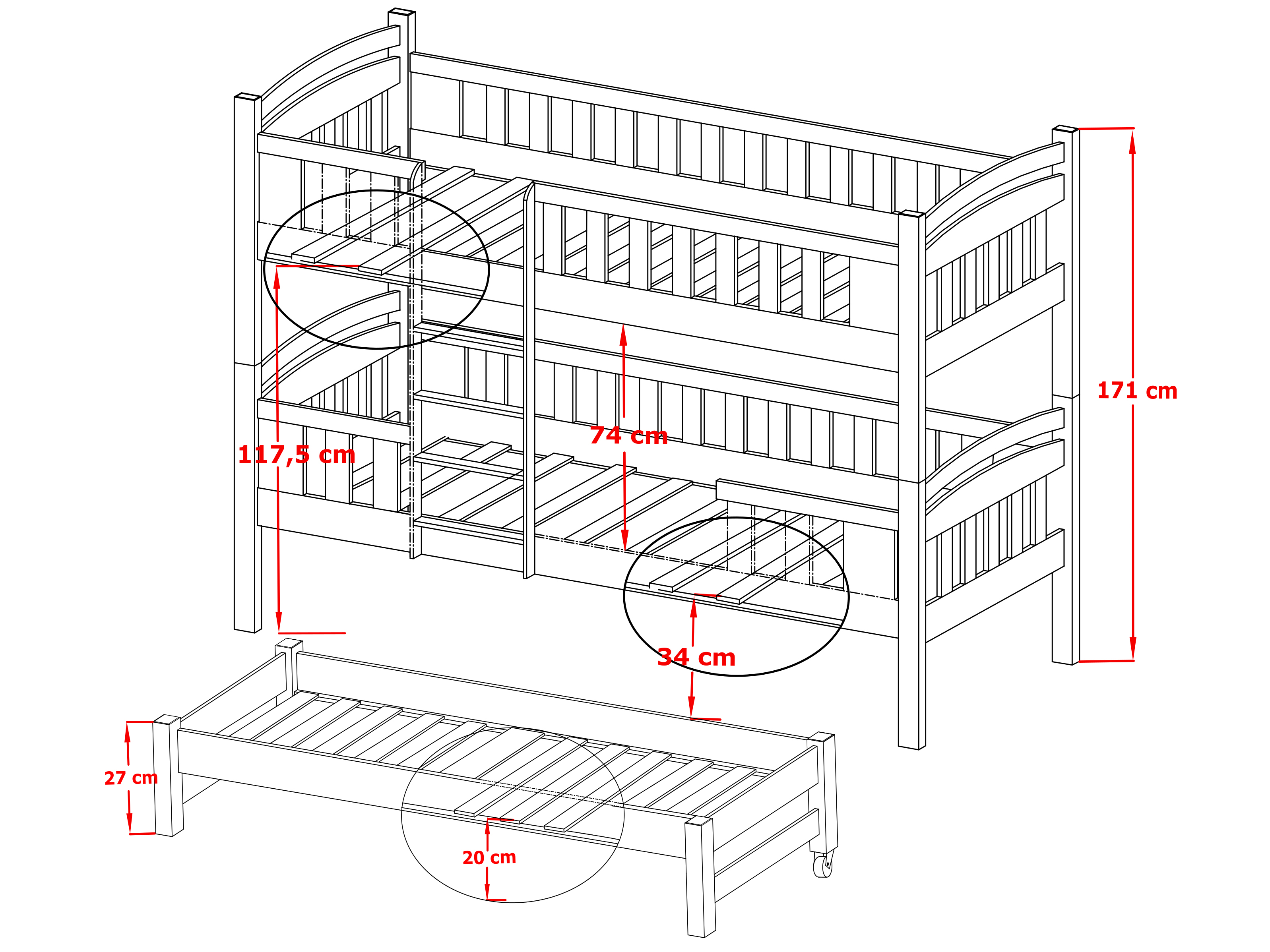Pat supraetajat cu bare de protecție împotriva căderii în timpul somnului. Este potrivit pentru camera copiilor. Scara patului poate fi asamblată pe partea dorită, stânga sau dreapta. Conține spațiu de depozitare sub forma a două sertare cu roți cauciucate, pentru a proteja podeaua. Se livrează dezasamblat.