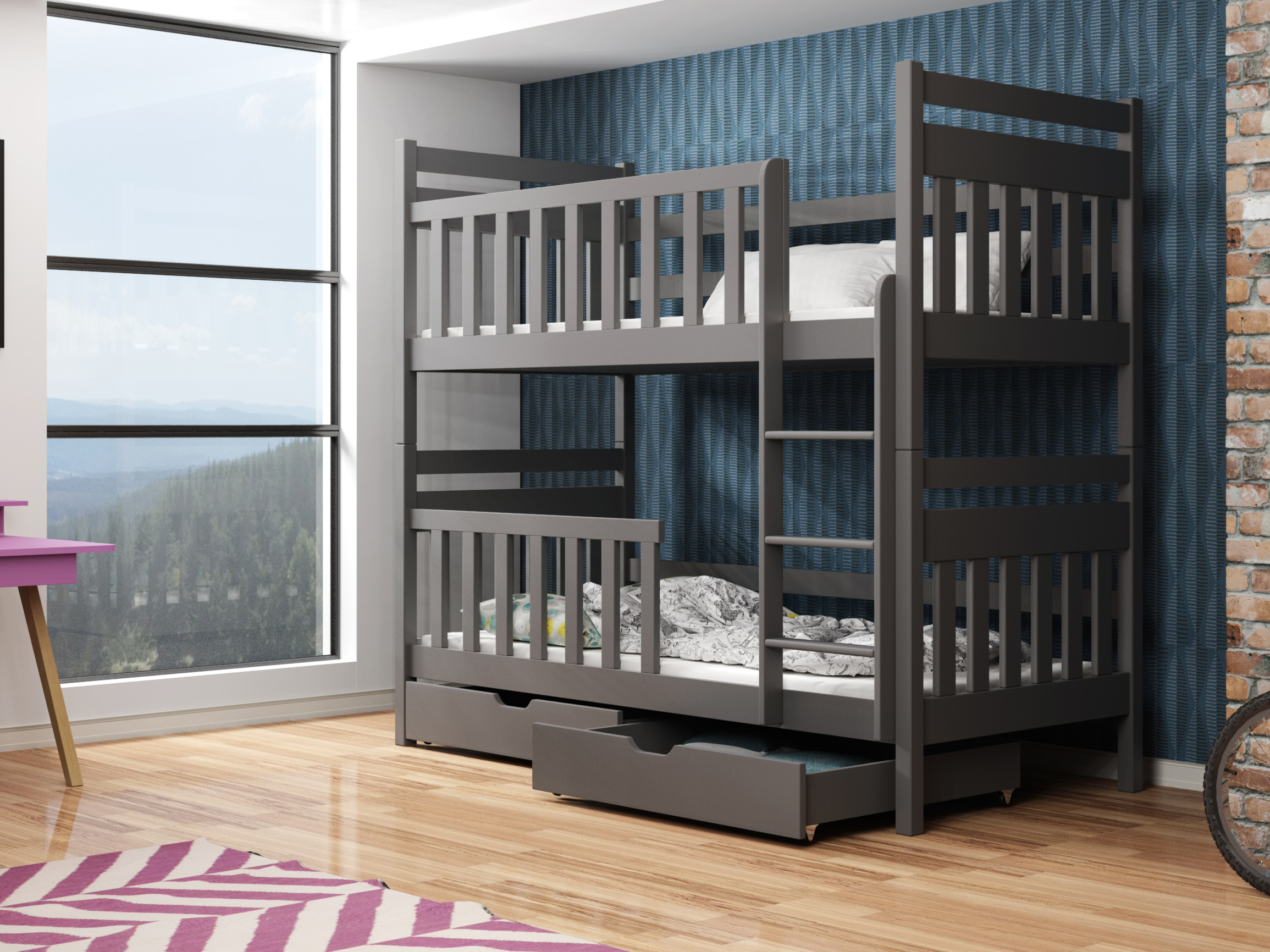 Pat supraetajat, din lemn de pin, cu bare de protecție împotriva căderii în timpul somnului. Este potrivit pentru camera copiilor. Scara patului poate fi asamblată pe partea dorită, stânga sau dreapta. Conține spațiu de depozitare sub forma a două sertare cu roți cauciucate, pentru a proteja podeaua. Se livrează dezasamblat.