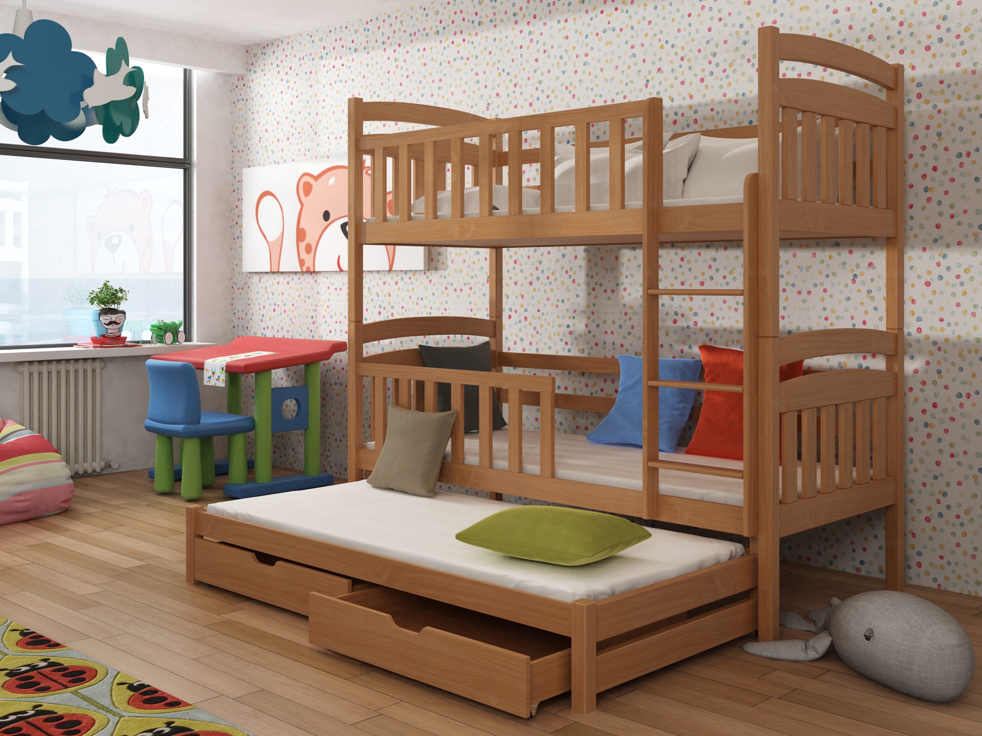 Patul Viola este un pat supraetajat înalt, potrivit pentru o cameră de copii cu trei frați. Înălțimea de la sol la salteaua superioară este de 135 cm, la salteaua mijlocie 50 cm iar la salteaua inferioară este de 35 cm. Patul conține deasemenea spațiu pentru depozitarea lenjeriei sau a jucăriilor.