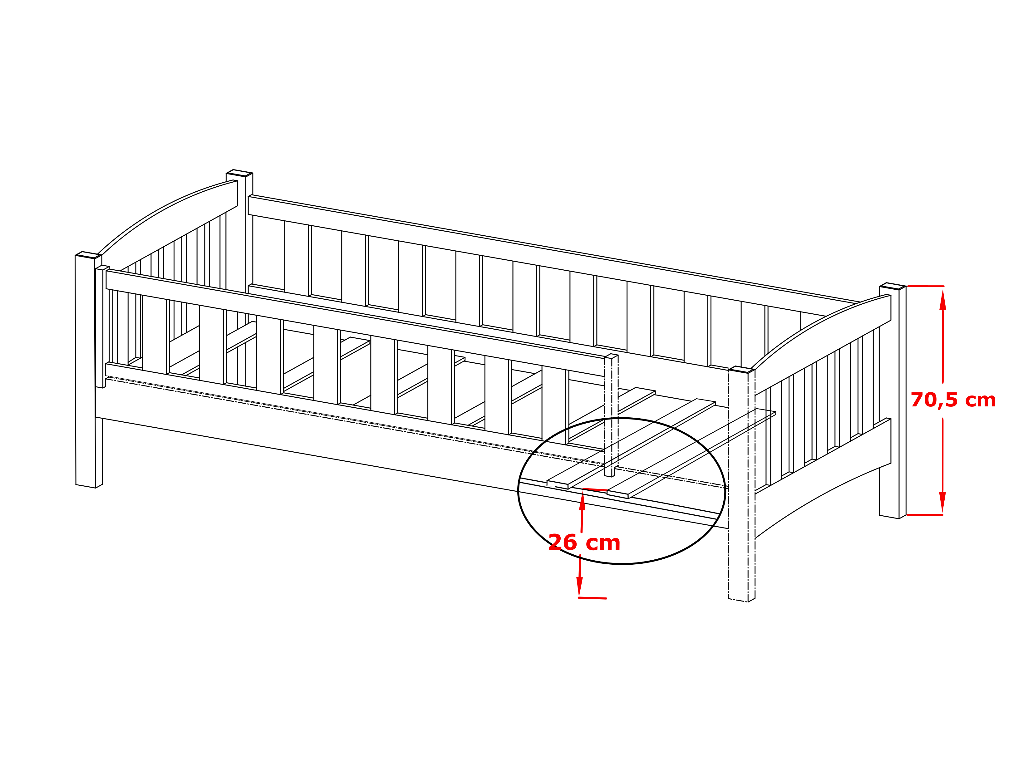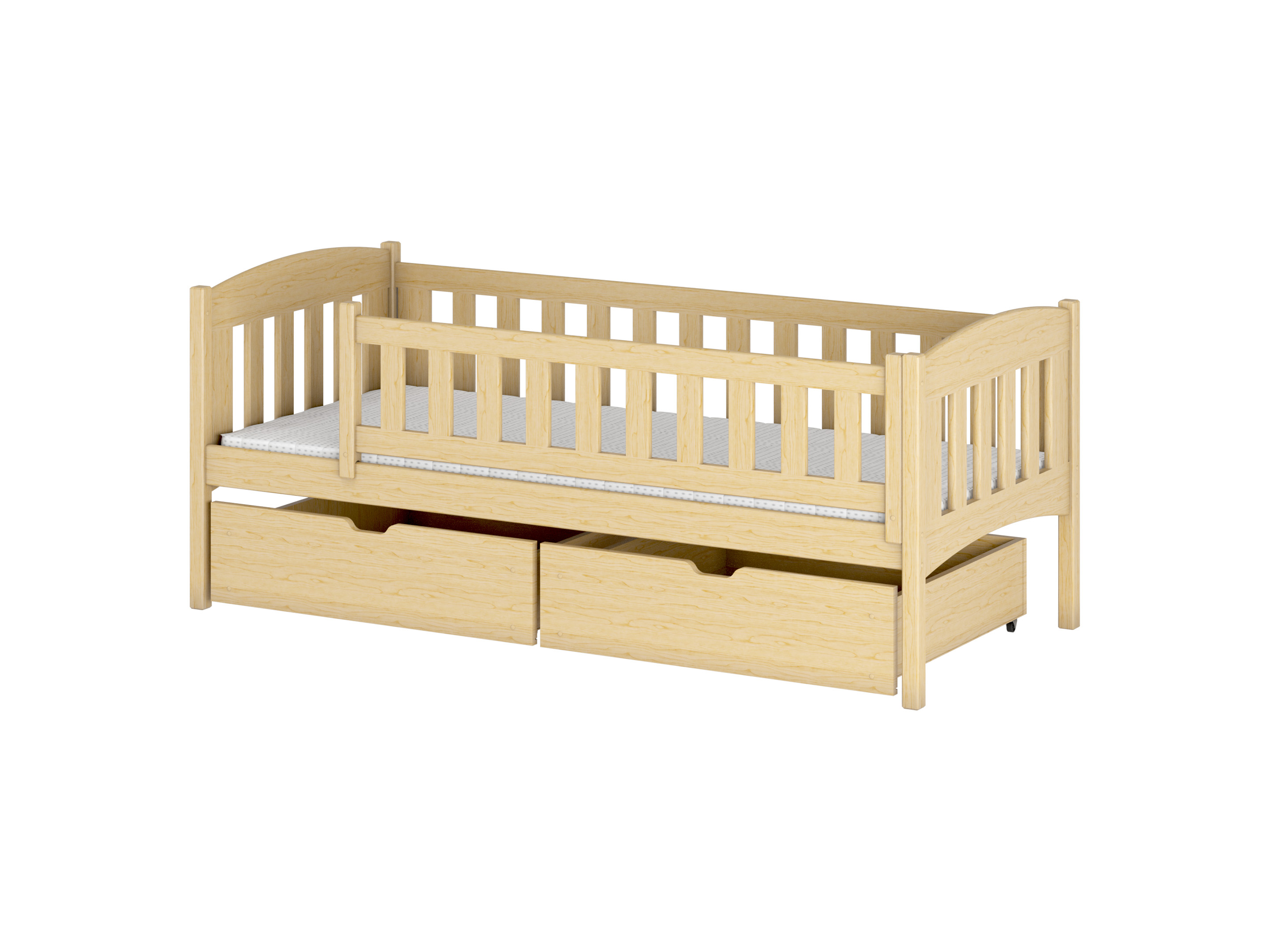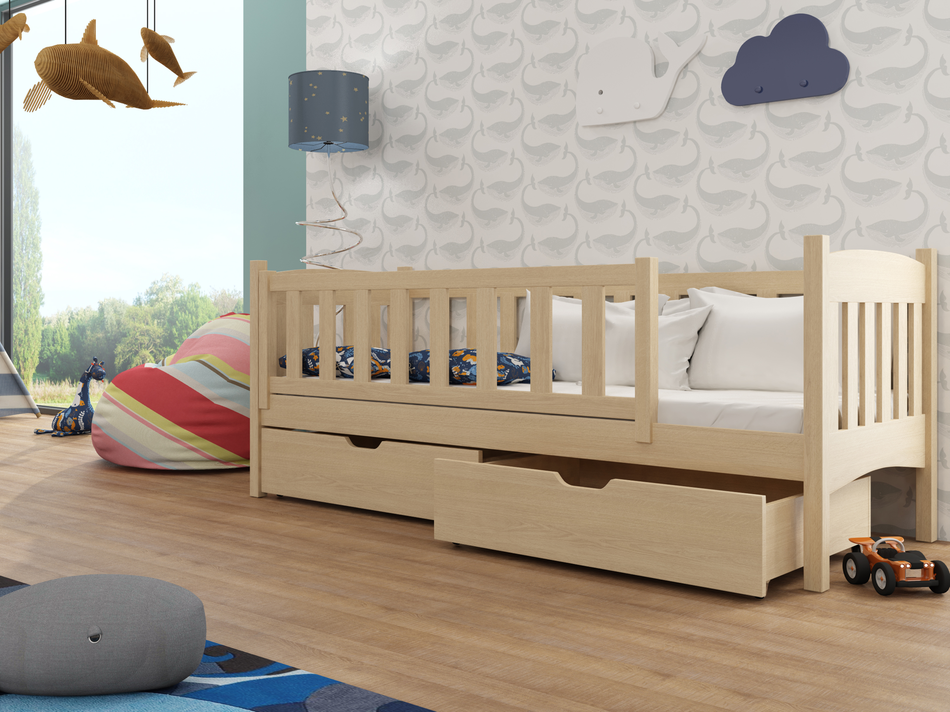 Pat de o persoană pentru copii, cu bare de protecție împotriva căderii. Este fabricat din plăci de lemn. Conține și spațiu de depozitare sub formă a două sertare cu roți cauciucate.