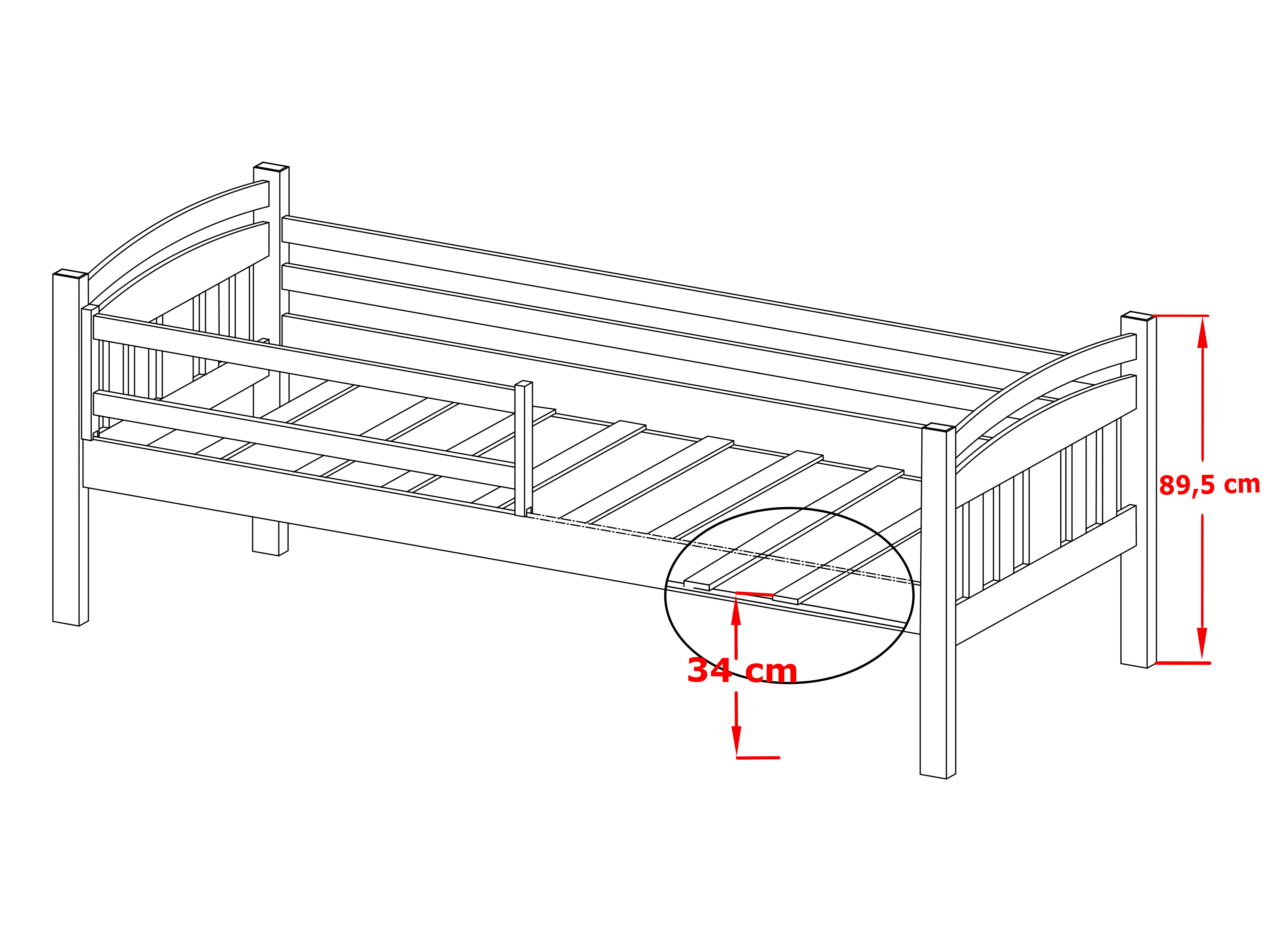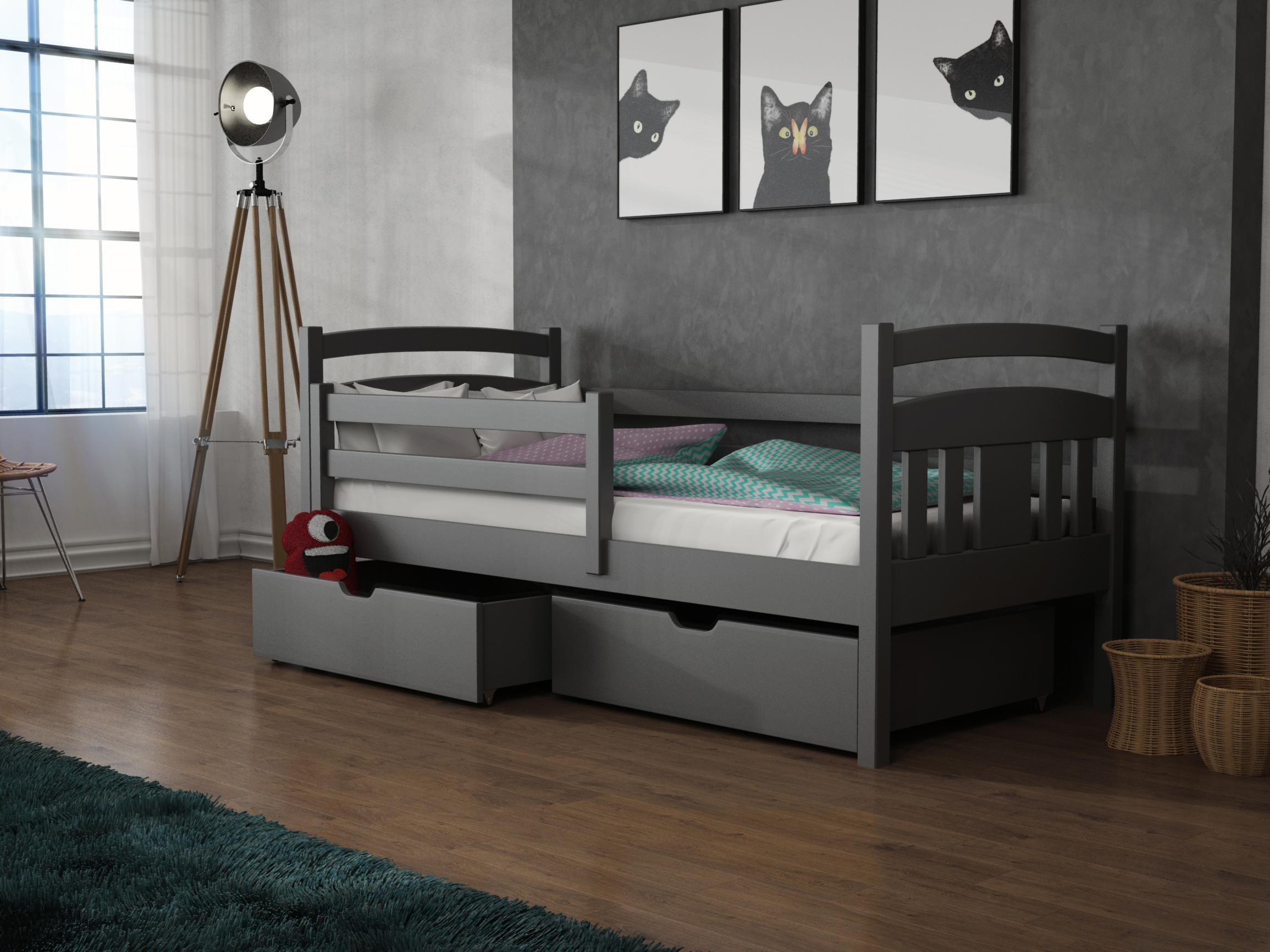 Pat de o persoană pentru copii, cu bare de protecție împotriva căderii. Este fabricat din lemn de pin. Conține și spațiu de depozitare sub formă a două sertare cu roți cauciucate.
