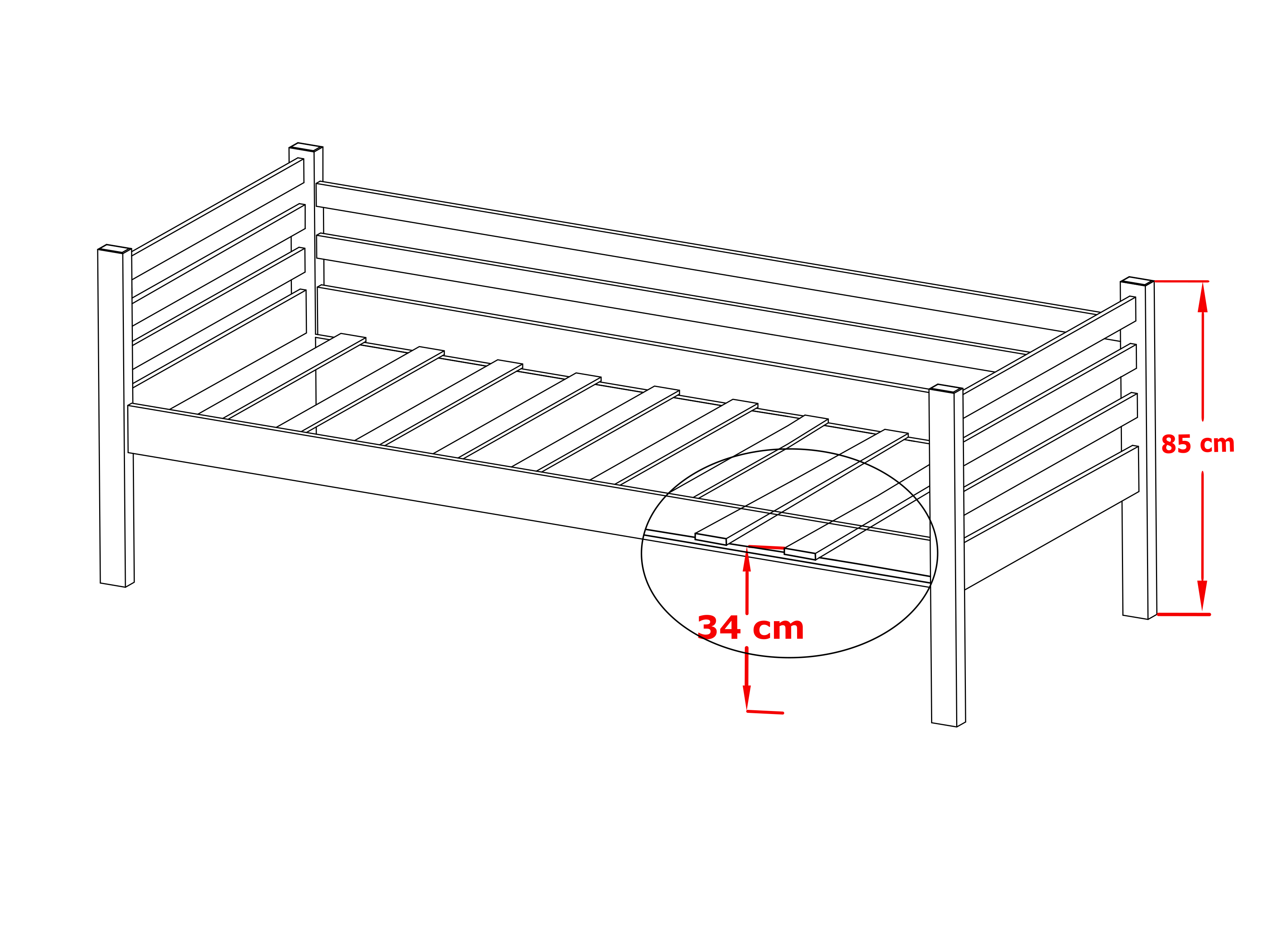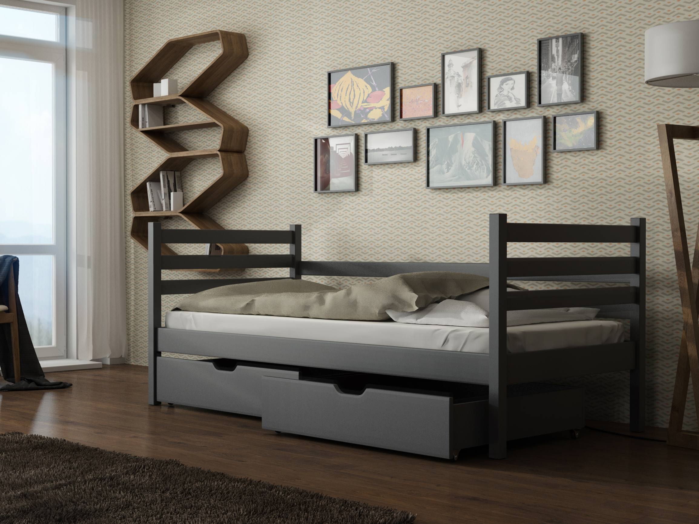 Pat de o persoană pentru copii, cu bare de protecție împotriva căderii. Este fabricat din plăci de lemn. Conține și spațiu de depozitare sub formă a două sertare cu roți cauciucate.