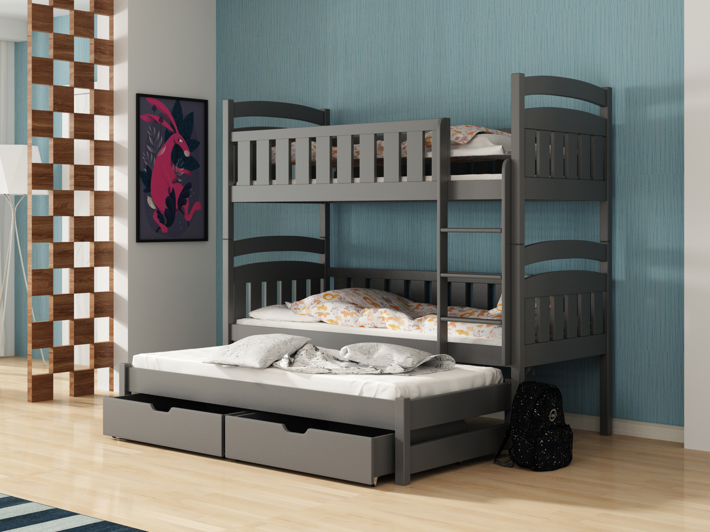 Patul Ollie este potrivit pentru camera de copii sau de studenți. Oferă 3 paturi, unde patul inferior este extensibil. Este fabricat din lemn de pin masiv. Pentru protecție în timpul somnului, patul mijlociu și superior conține bare de protecție. Patul conține și spațiu de depozitare sub formă a două sertare.