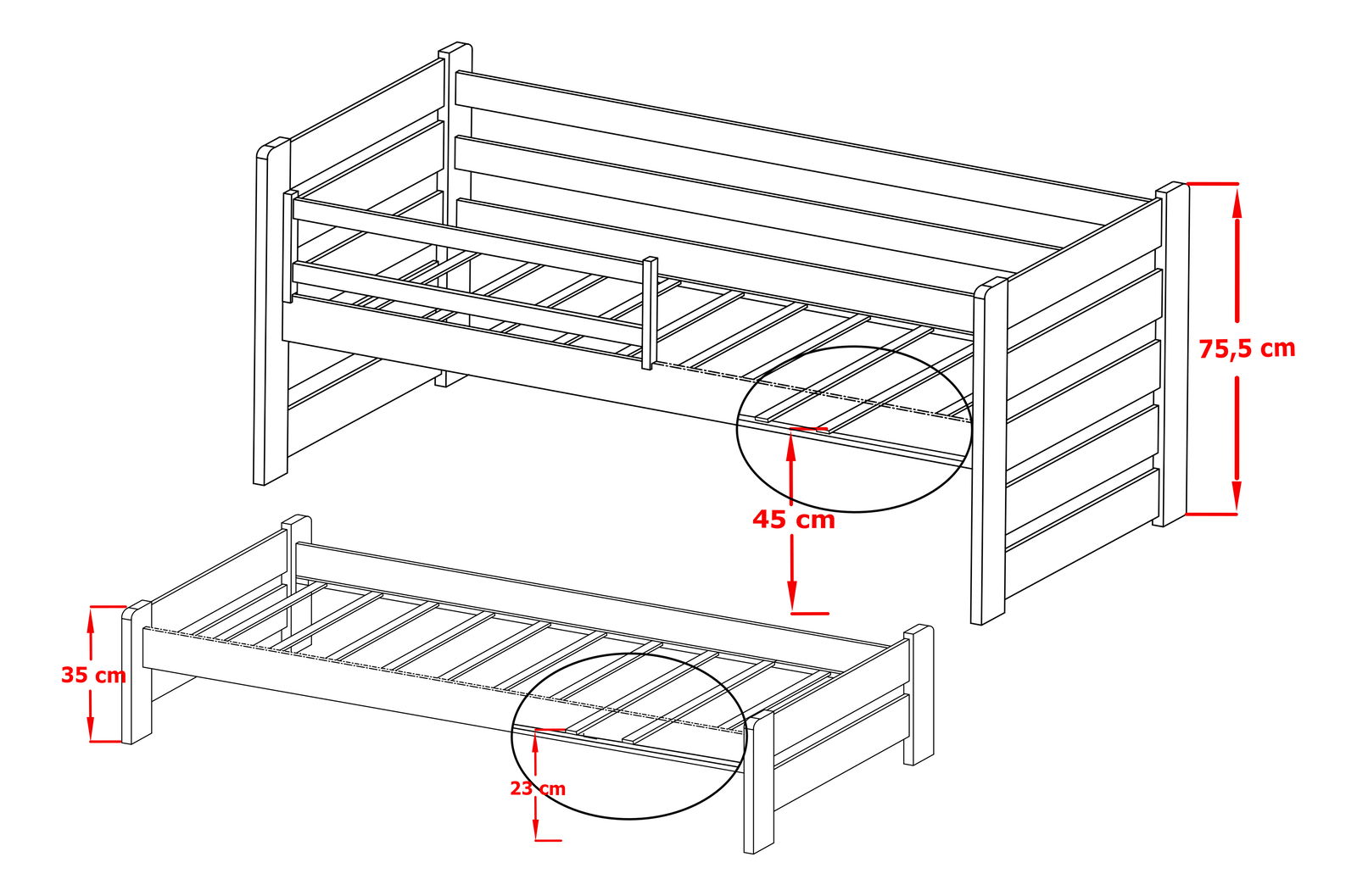 Pat supraetajat cu bare de protecție împotriva căderii în timpul somnului. Este potrivit pentru camera copiilor. Scara patului poate fi asamblată pe partea dorită, stânga sau dreapta. Se livrează dezasamblat.