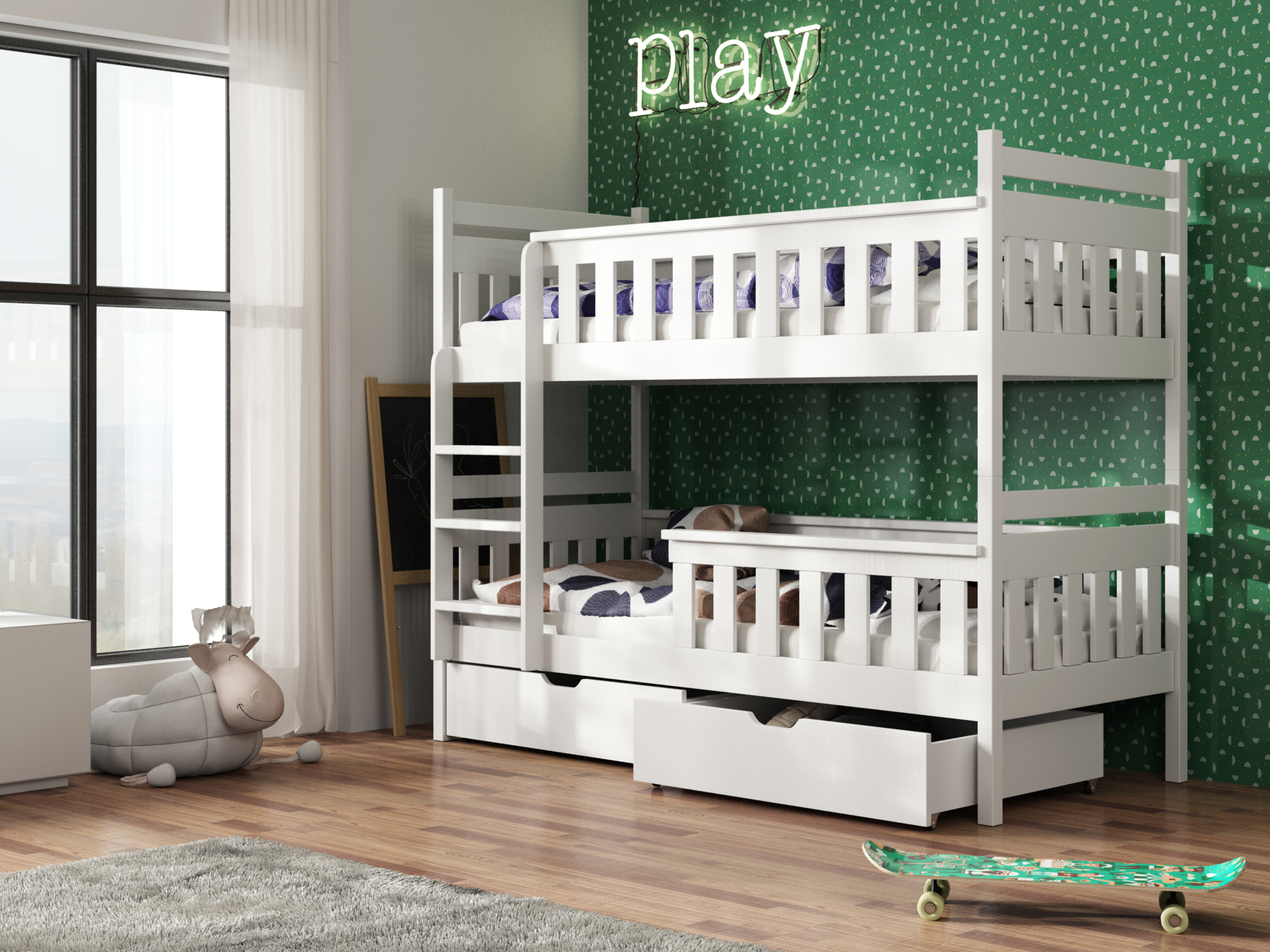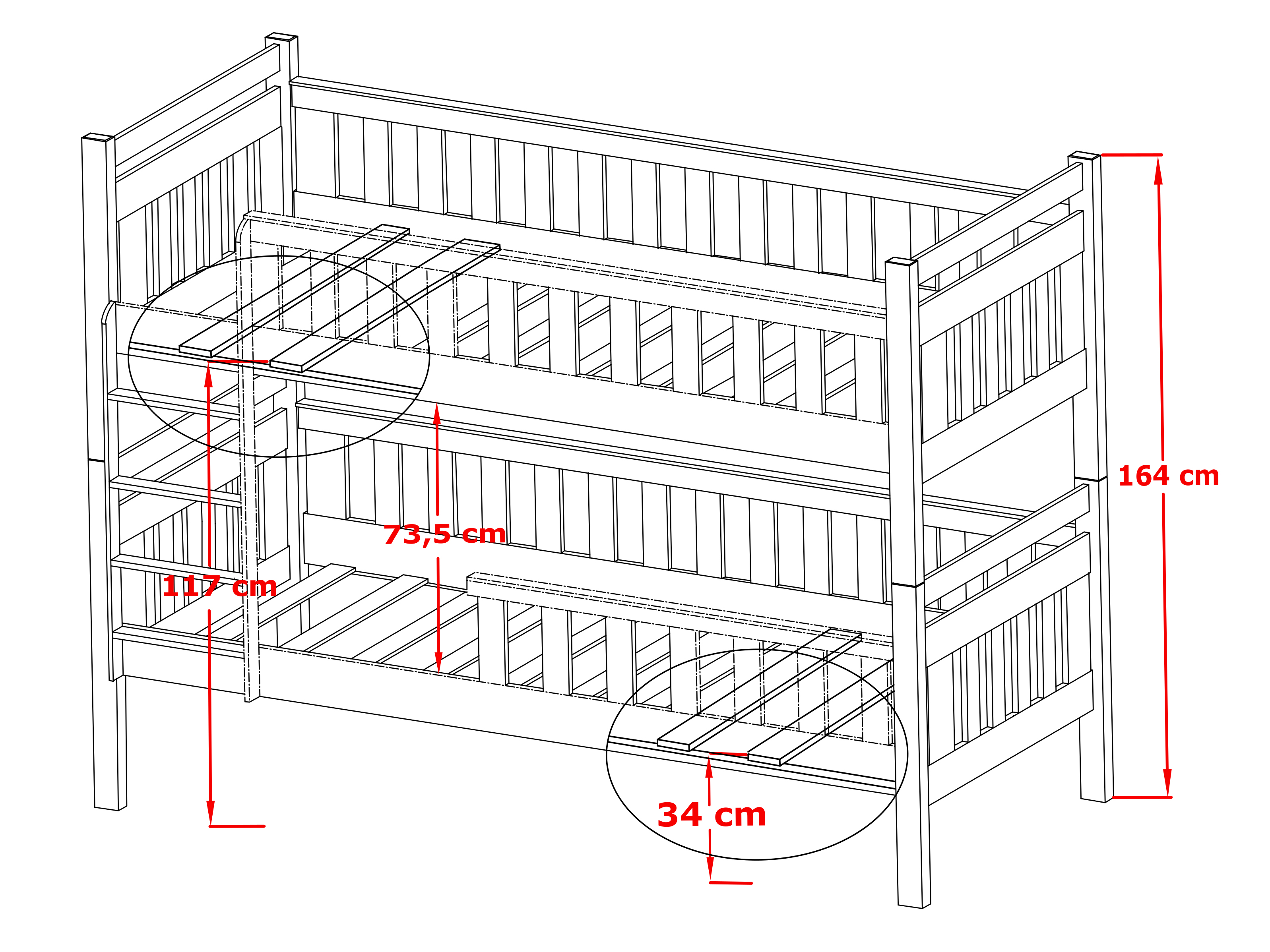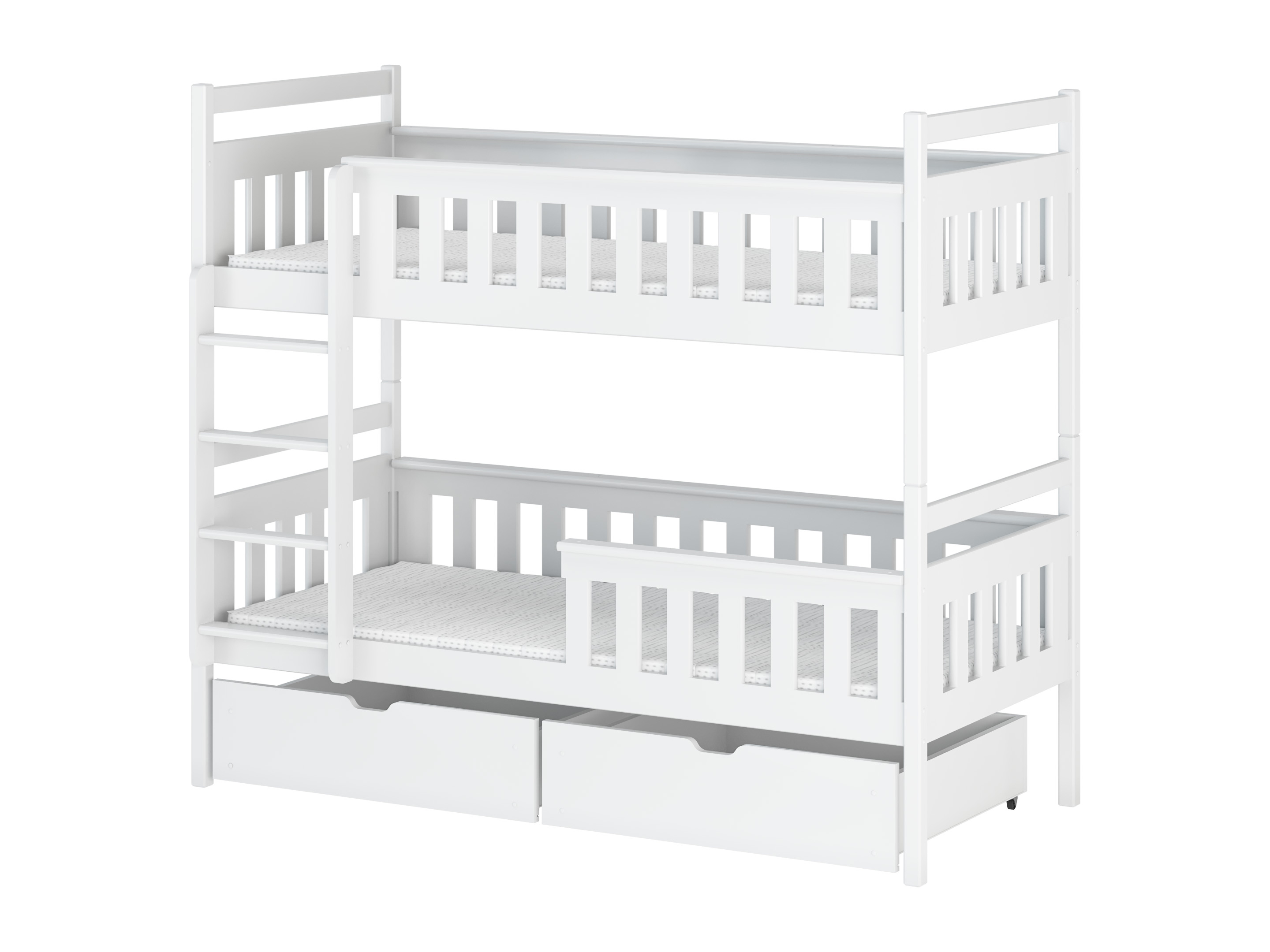 Pat supraetajat cu bare de protecție împotriva căderii în timpul somnului. Este potrivit pentru camera copiilor. Scara patului poate fi asamblată pe partea dorită, stânga sau dreapta. Se livrează dezasamblat.