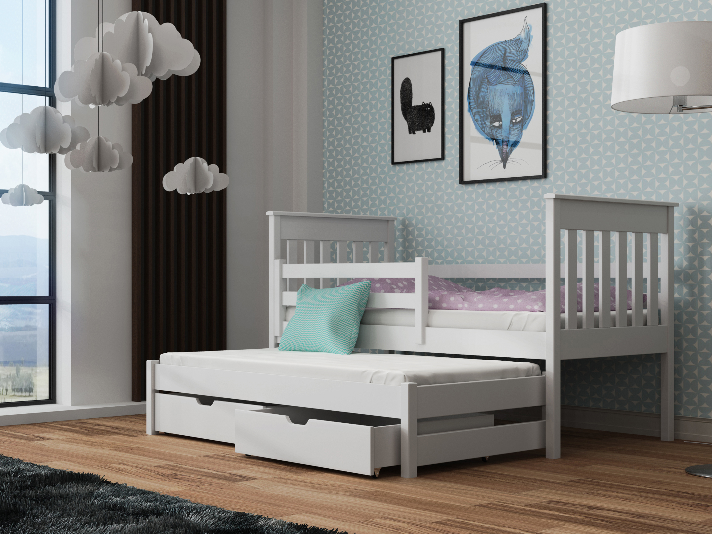 Pat supraetajat cu bare de protecție împotriva căderii în timpul somnului. Este potrivit pentru camera copiilor. Scara patului poate fi asamblată pe partea dorită, stânga sau dreapta. Se livrează dezasamblat.