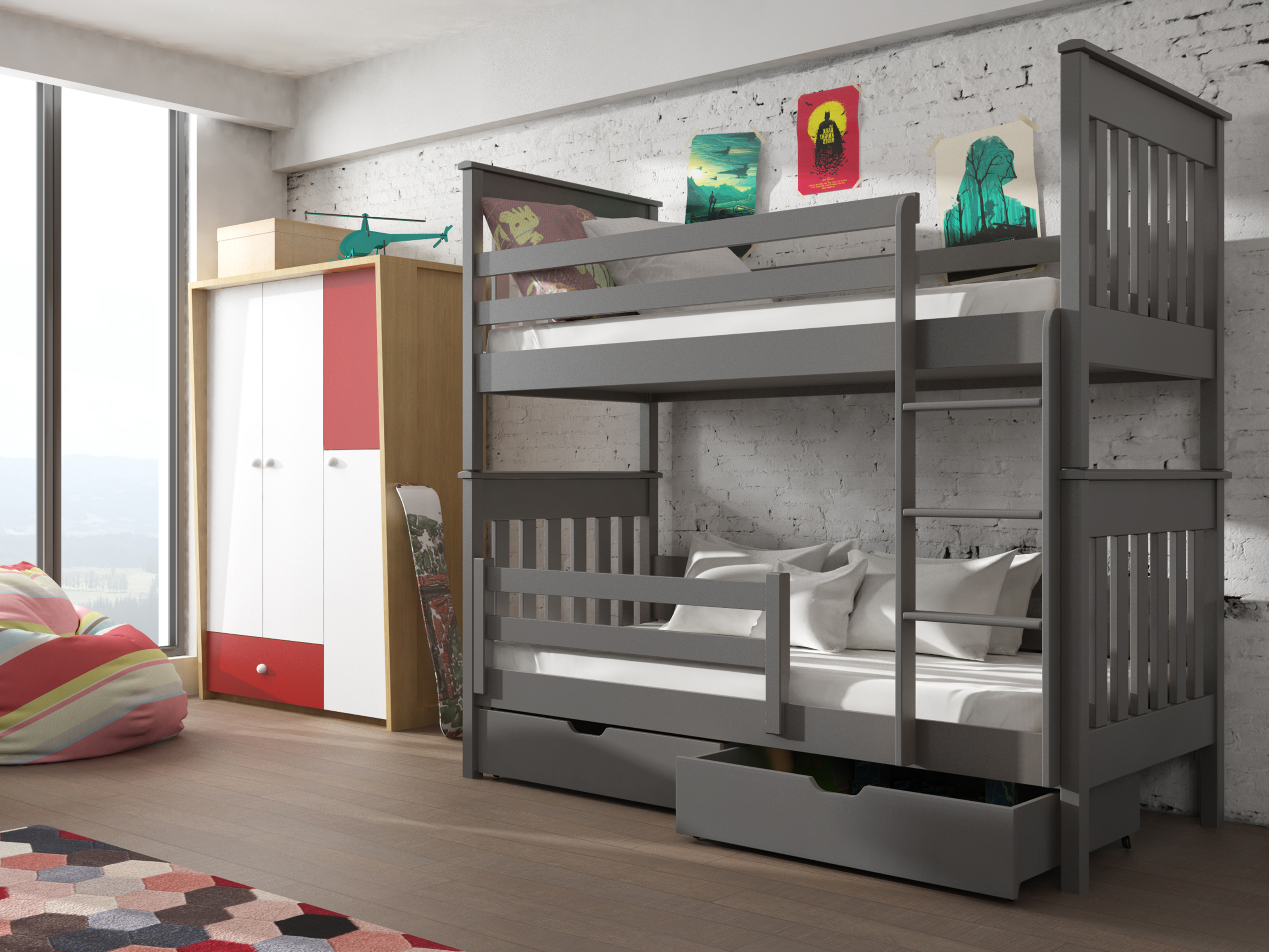 Pat supraetajat cu bare de protecție împotriva căderii în timpul somnului. Este potrivit pentru camera copiilor. Scara patului poate fi asamblată pe partea dorită, stânga sau dreapta. Conține spațiu de depozitare sub forma a două sertare cu roți cauciucate, pentru a proteja podeaua. Se livrează dezasamblat.