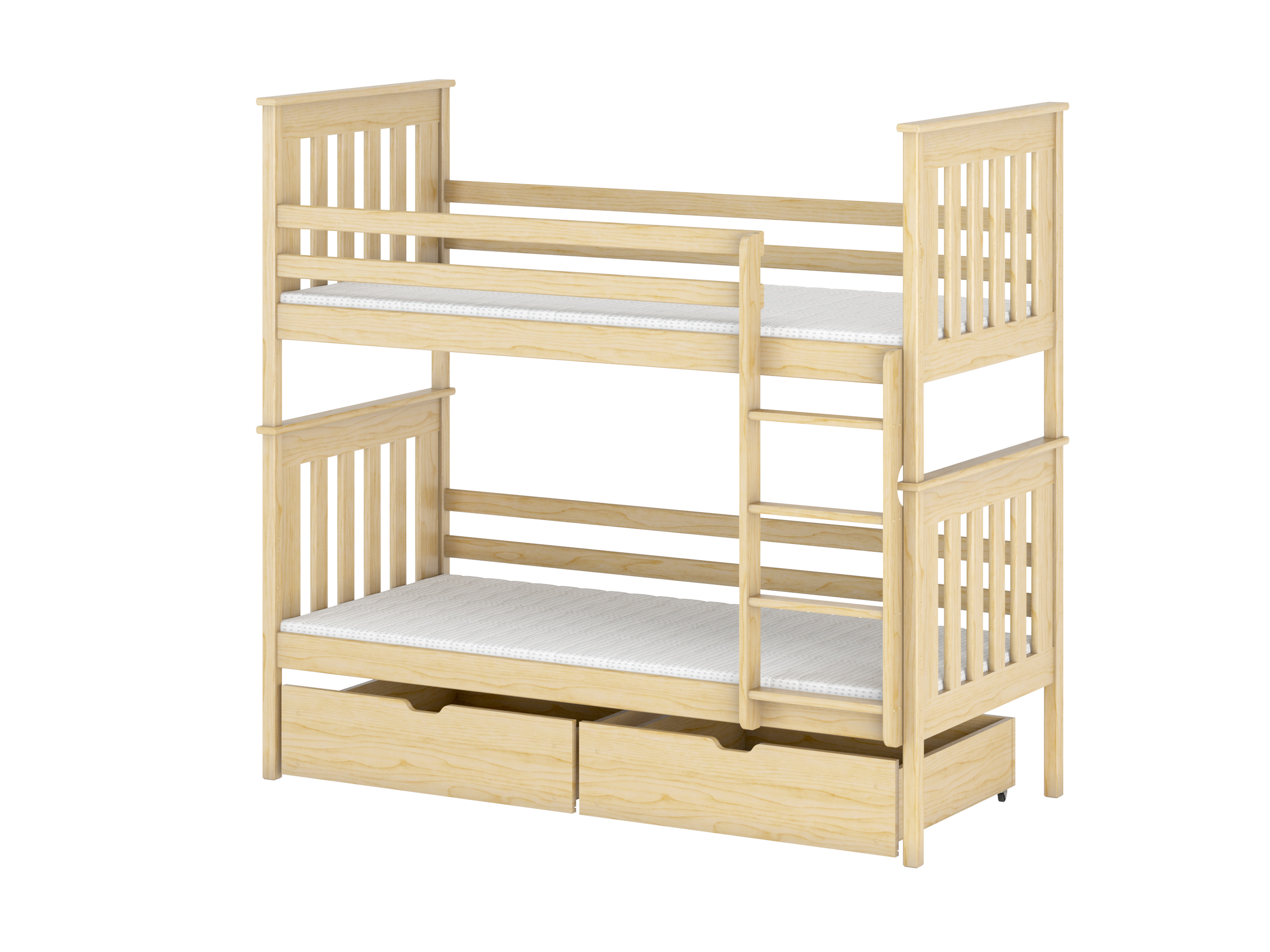 Pat supraetajat cu bare de protecție împotriva căderii în timpul somnului. Este potrivit pentru camera copiilor. Scara patului poate fi asamblată pe partea dorită, stânga sau dreapta. Conține spațiu de depozitare sub forma a două sertare cu roți cauciucate, pentru a proteja podeaua. Se livrează dezasamblat.