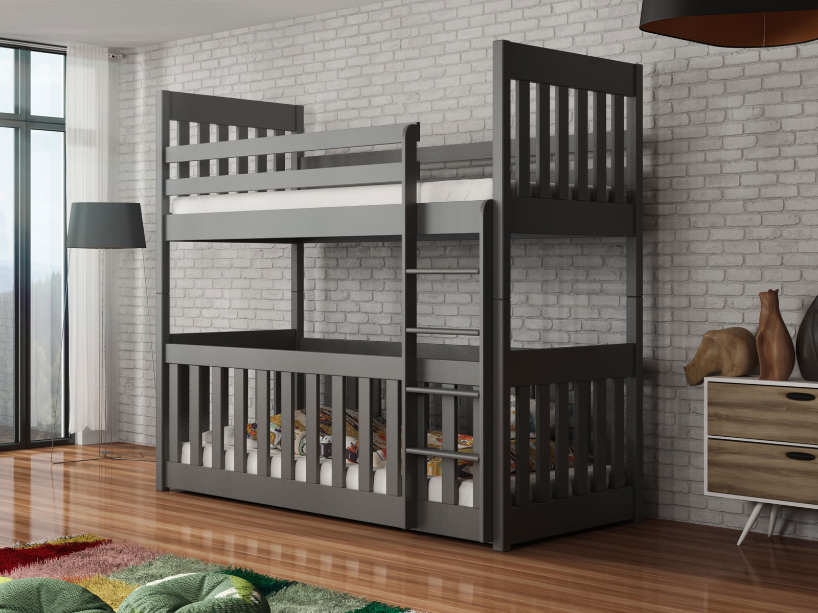 Pat supraetajat cu bare de protecție împotriva căderii în timpul somnului. Este potrivit pentru camera copiilor. Scara patului poate fi asamblată pe partea dorită, stânga sau dreapta. Conține spațiu de depozitare sub forma a două sertare cu roți cauciucate, pentru a proteja podeaua. Se livrează dezasamblat.