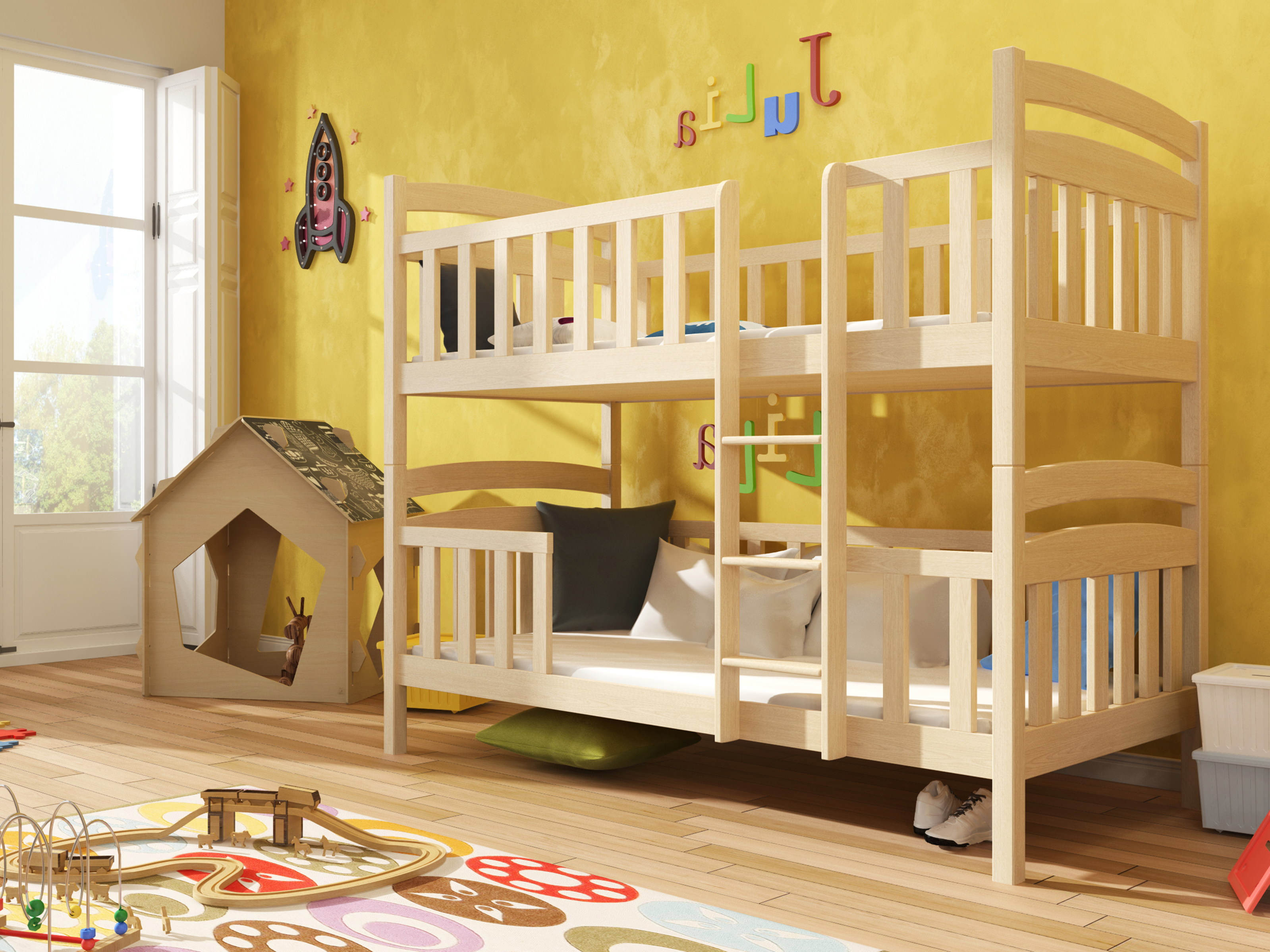 Pat supraetajat, din lemn de pin, cu bare de protecție împotriva căderii în timpul somnului. Este potrivit pentru camera copiilor. Scara patului poate fi asamblată pe partea dorită, stânga sau dreapta. Conține spațiu de depozitare sub forma a două sertare cu roți cauciucate, pentru a proteja podeaua. Se livrează dezasamblat.