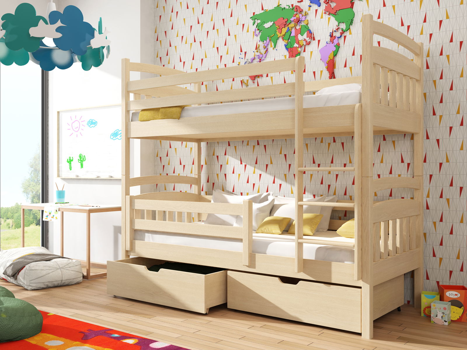 Pat supraetajat cu bare de protecție împotriva căderii în timpul somnului. Este potrivit pentru camera copiilor. Scara patului poate fi asamblată pe partea dorită, stânga sau dreapta. Se livrează dezasamblat.