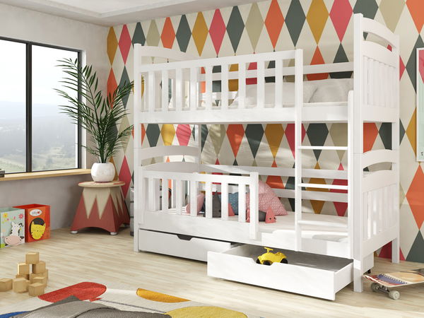 Pat supraetajat cu bare de protecție împotriva căderii în timpul somnului. Este potrivit pentru camera copiilor. Scara patului poate fi asamblată pe partea dorită, stânga sau dreapta. Conține spațiu de depozitare sub forma a două sertare cu roți cauciucate, pentru a proteja podeaua. Se livrează dezasamblat.