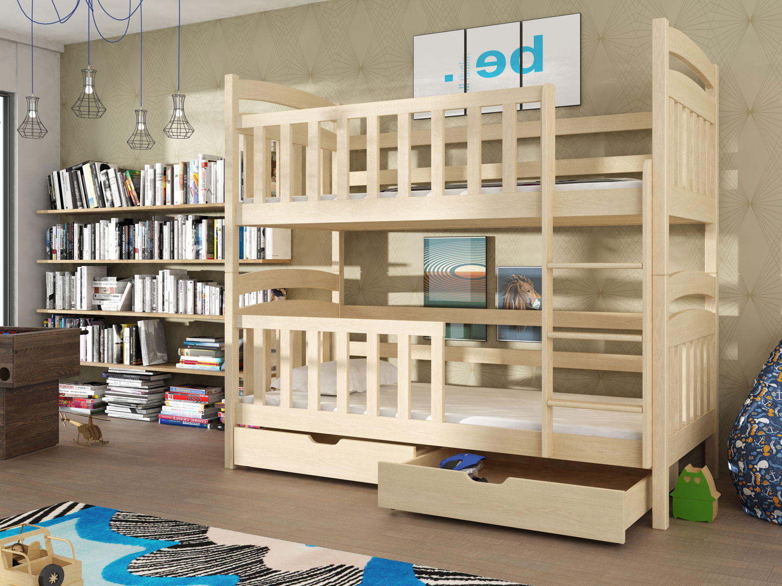 Pat supraetajat cu bare de protecție împotriva căderii în timpul somnului. Este potrivit pentru camera copiilor. Scara patului poate fi asamblată pe partea dorită, stânga sau dreapta. Conține spațiu de depozitare sub forma a două sertare cu roți cauciucate, pentru a proteja podeaua. Se livrează dezasamblat.