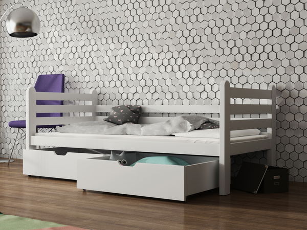 Pat de o persoană Somer este potrivit pentru camera de copii. Patul este fabricat din lemn masiv de pin care atrage mai puțin praf. Are bare de protecție și spațiu de depozitare sub forma sertarelor.
