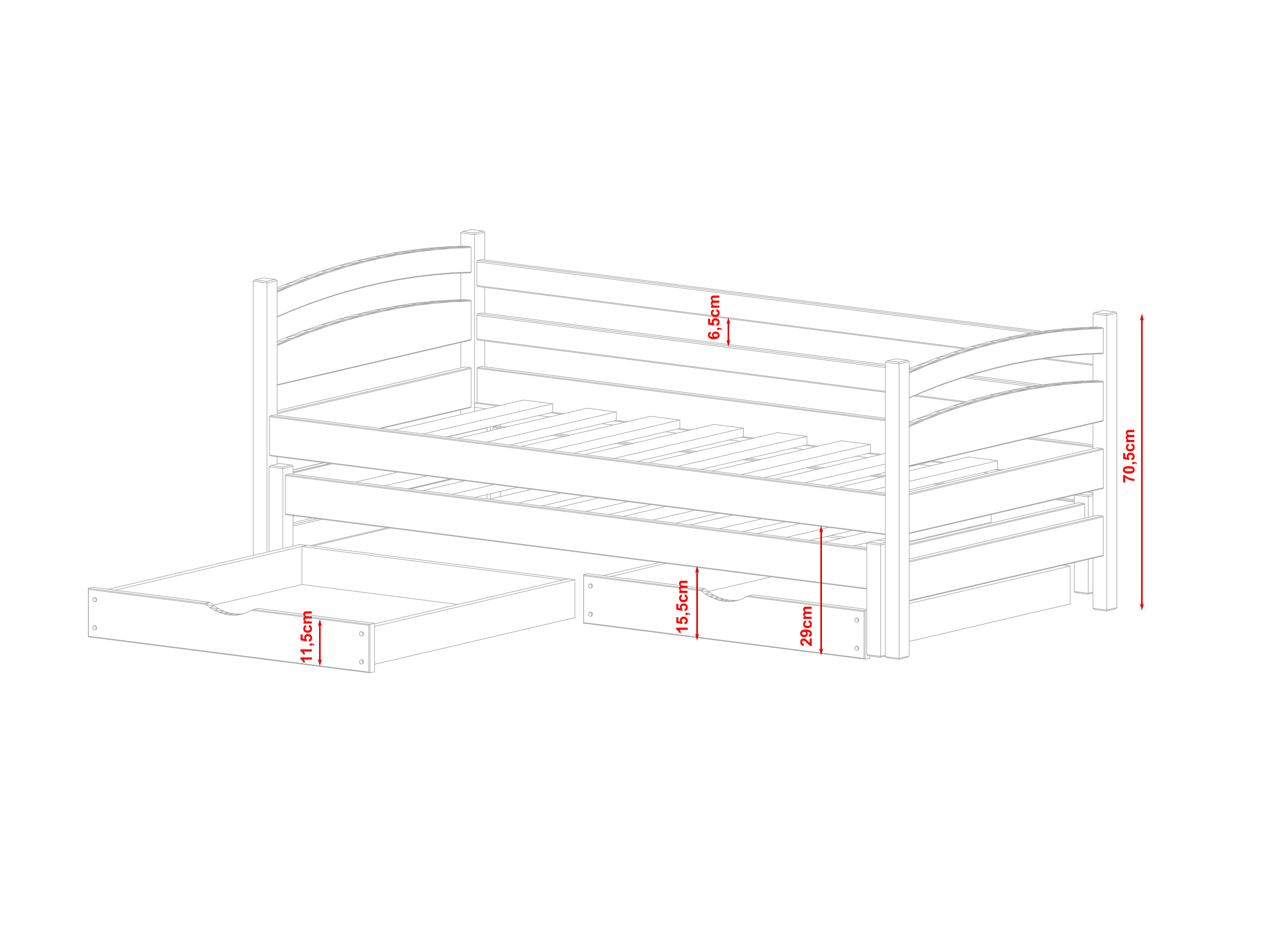 Pat supraetajat cu bare de protecție împotriva căderii în timpul somnului. Este potrivit pentru camera copiilor. Scara patului poate fi asamblată pe partea dorită, stânga sau dreapta. Se livrează dezasamblat.