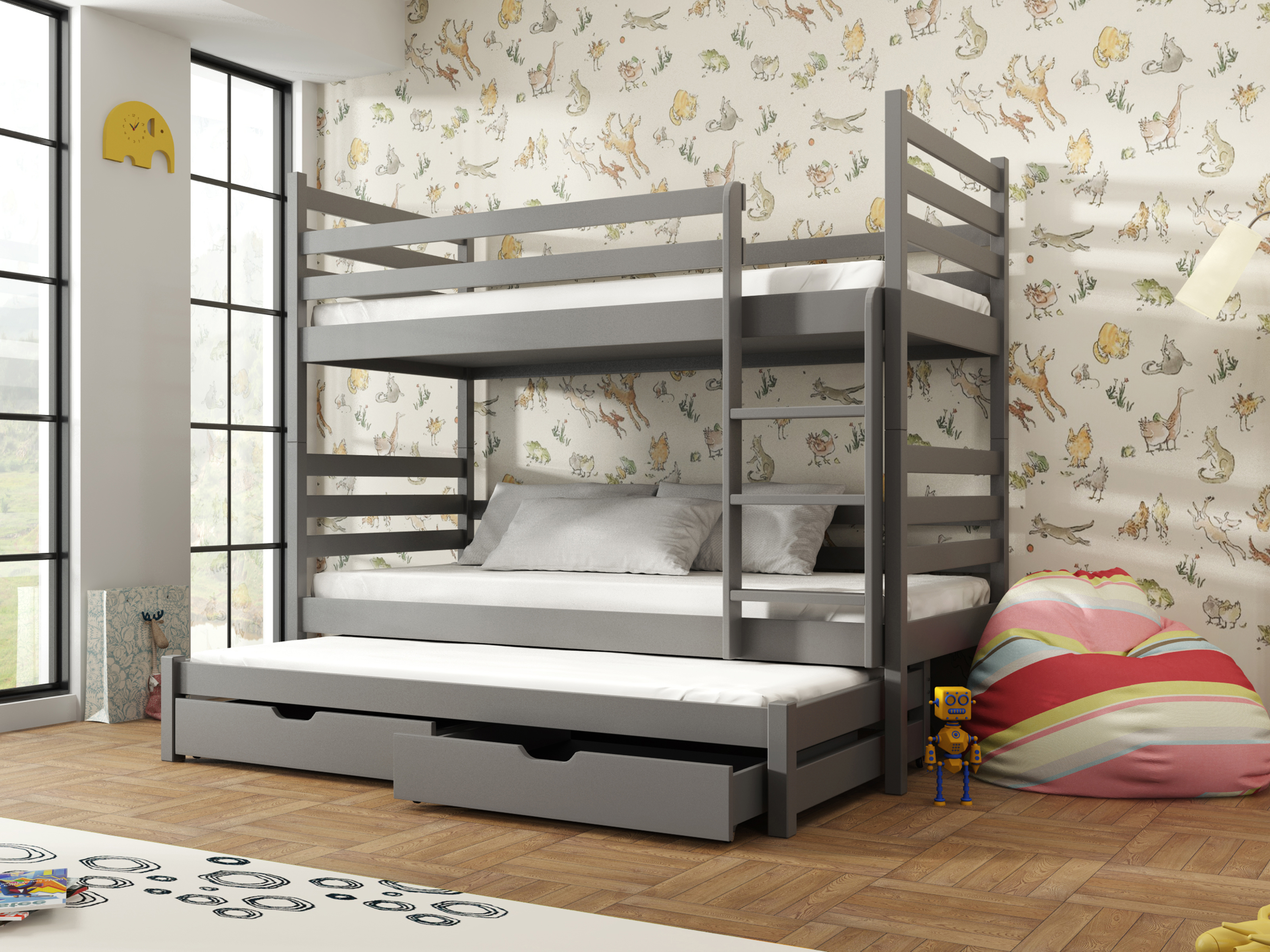Pat supraetajat cu bare de protecție împotriva căderii în timpul somnului. Este potrivit pentru camera copiilor. Scara patului poate fi asamblată pe partea dorită, stânga sau dreapta. Se livrează dezasamblat.