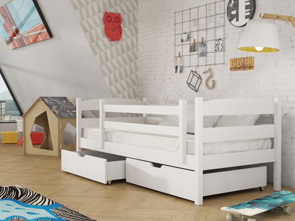 Pat de o persoană Somer este potrivit pentru camera de copii. Patul este fabricat din lemn de pin impregnat care atrage mai puțin praf. Are bare de protecție și spațiu de depozitare sub forma sertarelor.