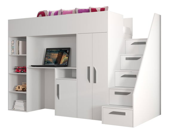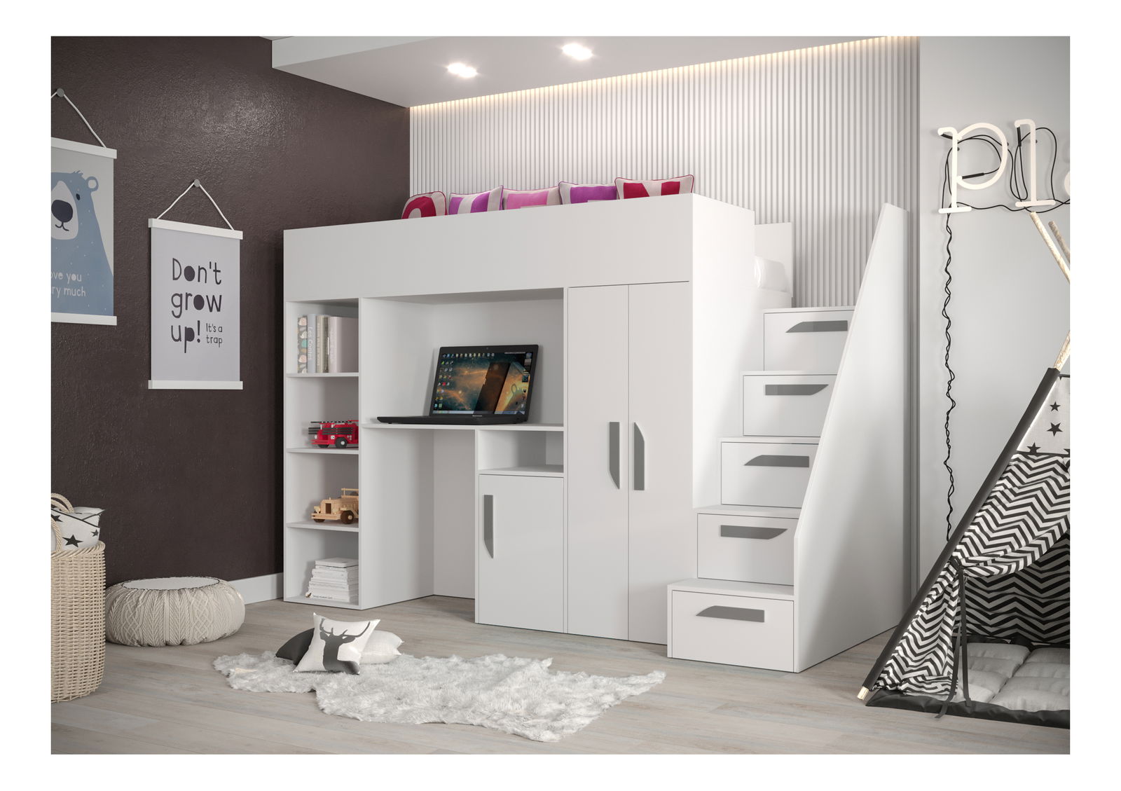 Pat pentru copii combinat 90 cm Puro 14 (alb mat + alb lucios + mânere gri)