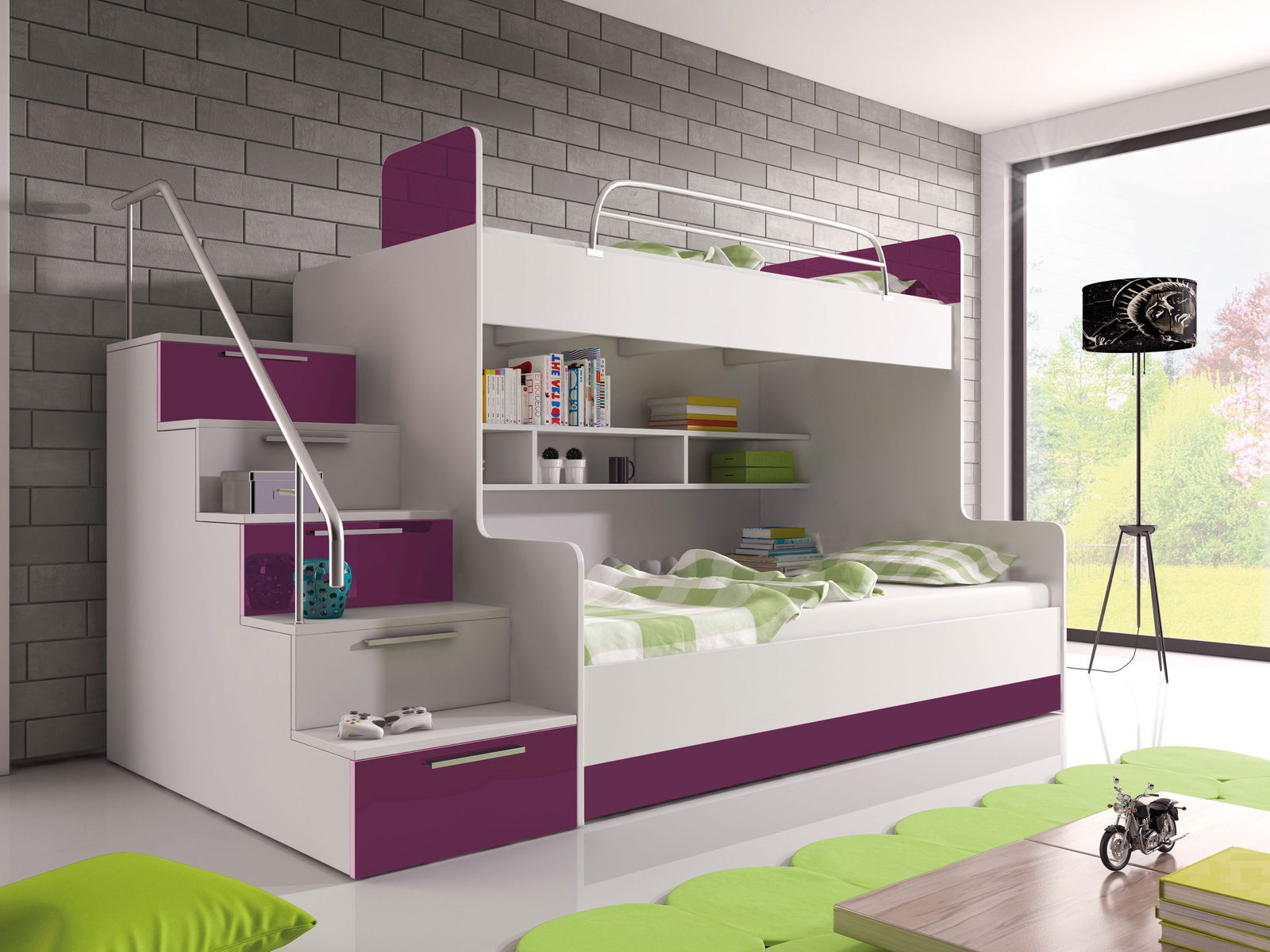 Un set foarte practic pentru camera copiilor, care include un pat suprapus cu două zone de dormit, scări și un spațiu mare de depozitare sub formă de rafturi. Ideal pentru interioare mai mici. Fabricat din placă MDF de înaltă calitate, prin care ușa și sertarele au o suprafață acrilică acoperită cu lac de 0,8 mm grosime.