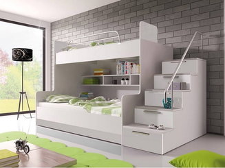 Patul supraetajat doar pentru un singur copil? De ce nu? În partea de sus, de obicei, vor avea patul iar în partea inferioară un birou pentru școală și un dulap încorporat pentru haine. Există modele care oferă și spațiu de joacă sub pat, unde puteți amplasa, de exemplu, un fotoliu puf și un raft pentru jucării. Un pat supraetajat înalt cu tobogan poate aduce cu siguranță bucurie celor mici.
