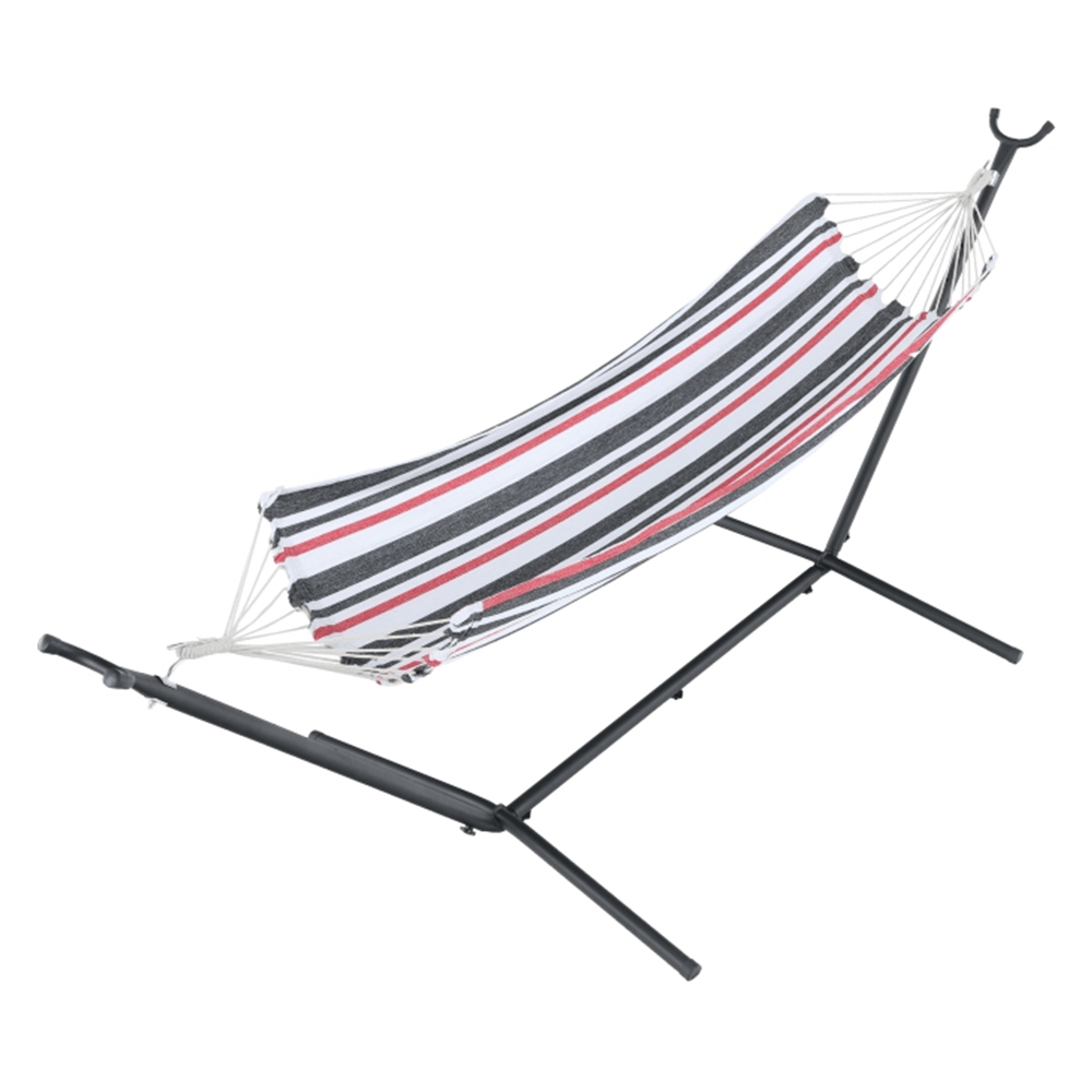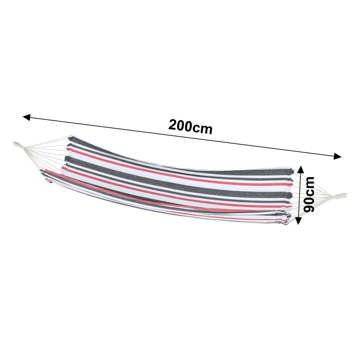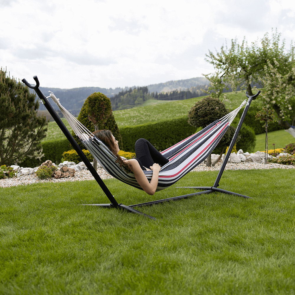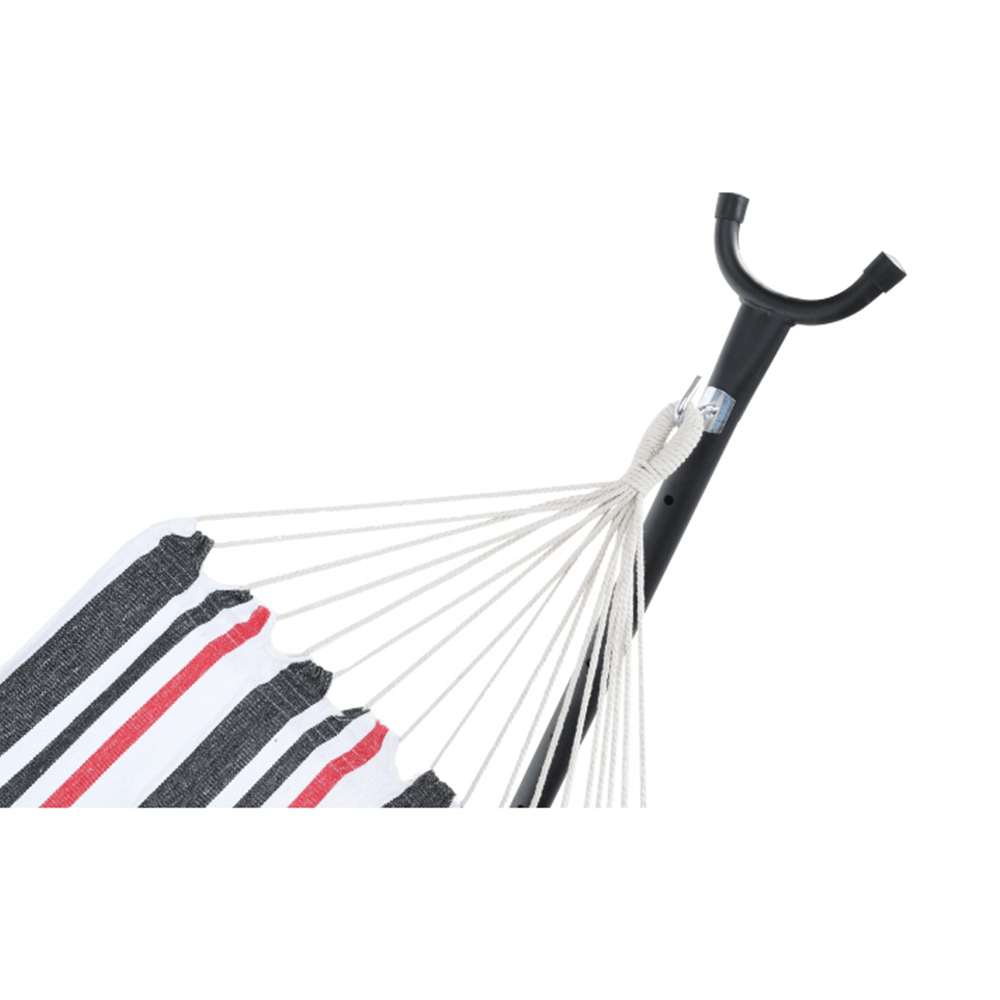 Realizat din 65% bumbac și 35% țesătură din poliester. Într-un design plăcut, cu un model dungi. Capacitatea sa de încărcare este de până la 120 kg. Este potrivit și pentru două persoane. Hamacul poate fi fixat pe o pereche de copaci sau să fie agățat de o structură specială, permițându-i să fie folosit și în interior. Un suport selectat corespunzător va crește capacitatea de încărcare și stabilitatea hamacului. Stabilitatea și greutatea sunt determinate și de alegerea corectă a stativului. Stativul OTAN TYPE 1 din oferta noastră are o construcție solidă, în timp ce relaxarea în hamac vă oferă un sentiment de securitate și siguranță.