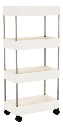 Dacă aveți nevoie să vă extindeți spațiul de depozitare sau să umpleți eficient și cu gust un spațiu gol din casa dvs. alegeți raftul mobil cu 4 etajere Daniel. Raftul este fabricat din metal, iar etajerele adânci sunt fabricate din plastic. În plus, baza acestora este găurită, ceea ce asigură circulația aerului. Raftul Daniel este echipat și cu rotițe pentru o manevrare ușoară, două dintre rotițe având frâne. Asigurați ordinea cu această piesă modernă și practică.