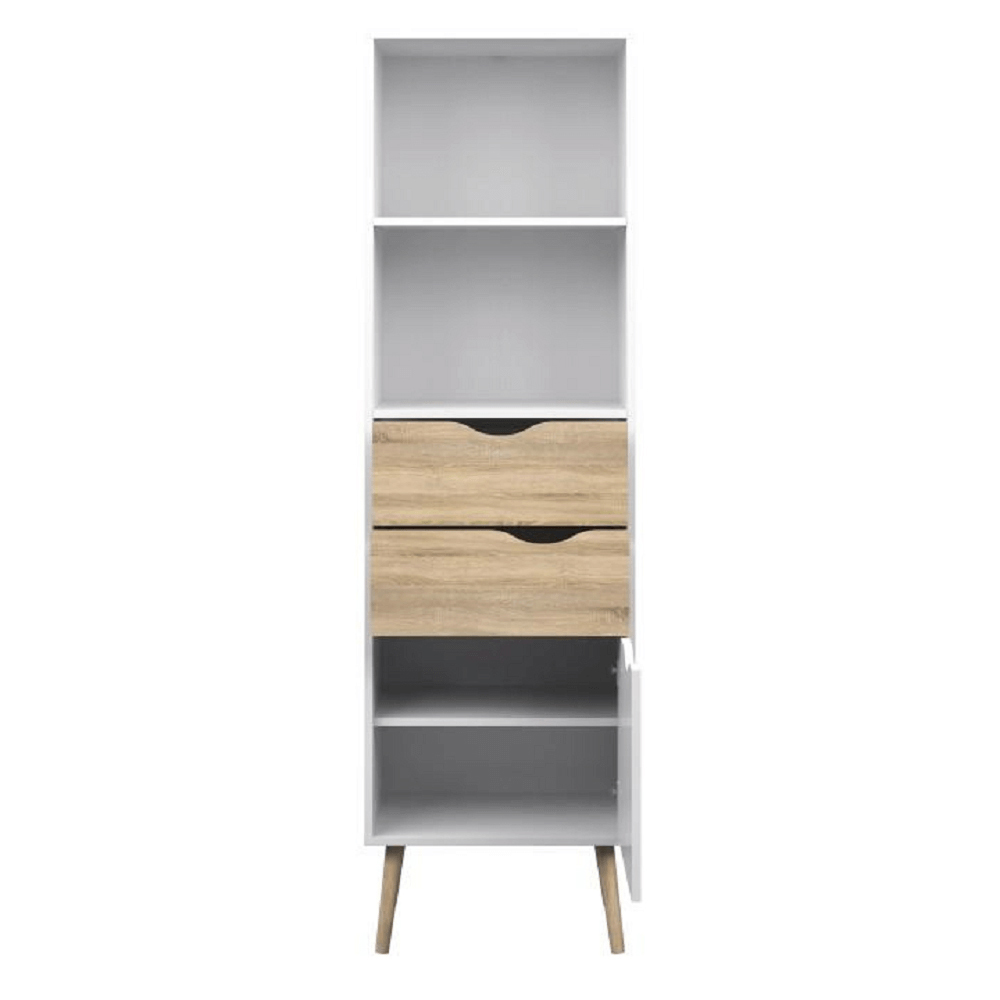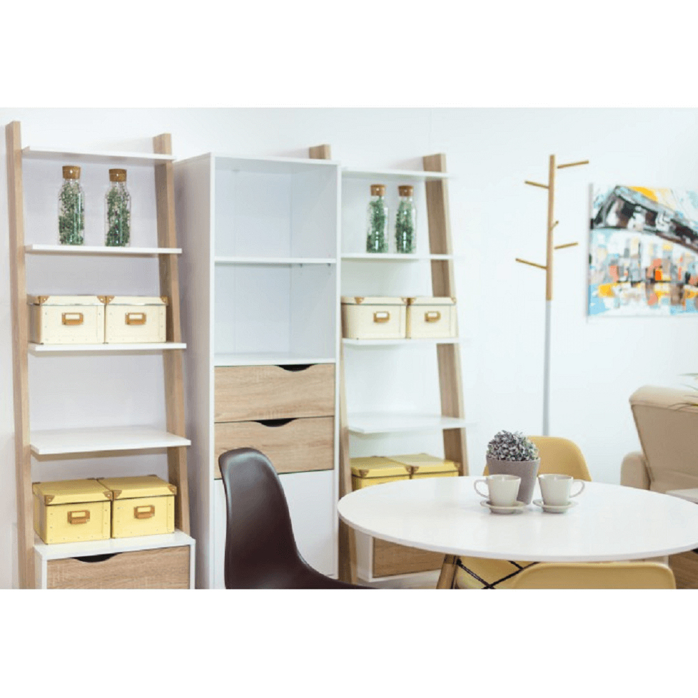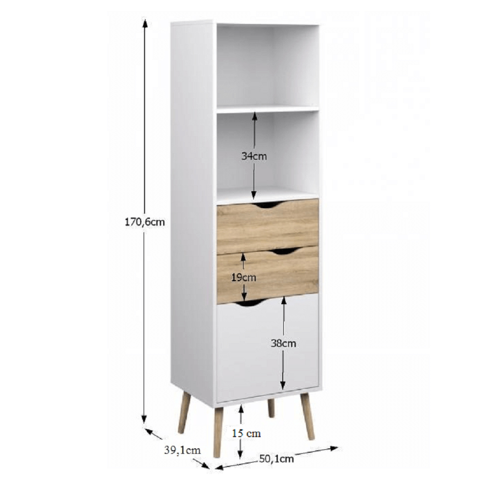 Raft în stil retro, cu patru picioare și două rafturi deschise, două sertare și o ușă. Este potrivit pentru birou, camere de zi sau chiar camere pentru studenți.