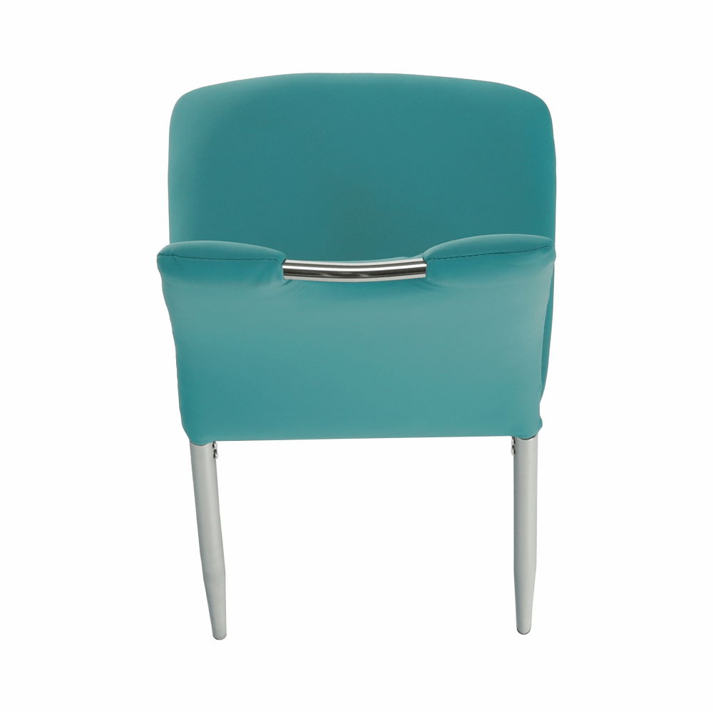 Scaun de sufragerie cu spate rotunjit, cu decupaj în partea superioară și picioare rotunjite cromate. Înălțimea de ședere este de 45,5 cm.