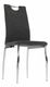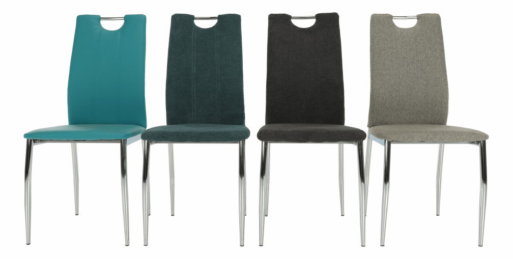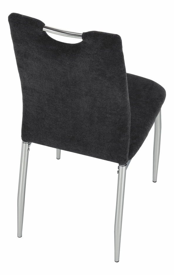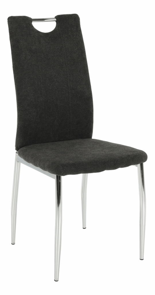 Scaunul frumos de sufragerie are un spătar rotunjit, cu o decupare în partea superioară și cu picioare din crom rotunjite.