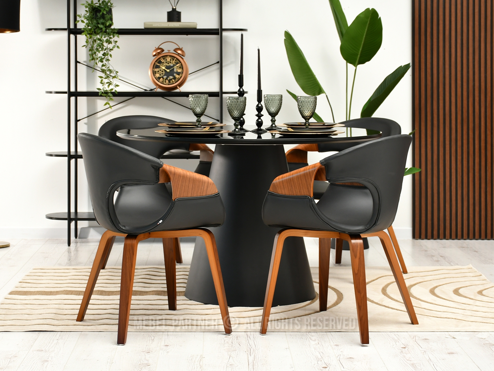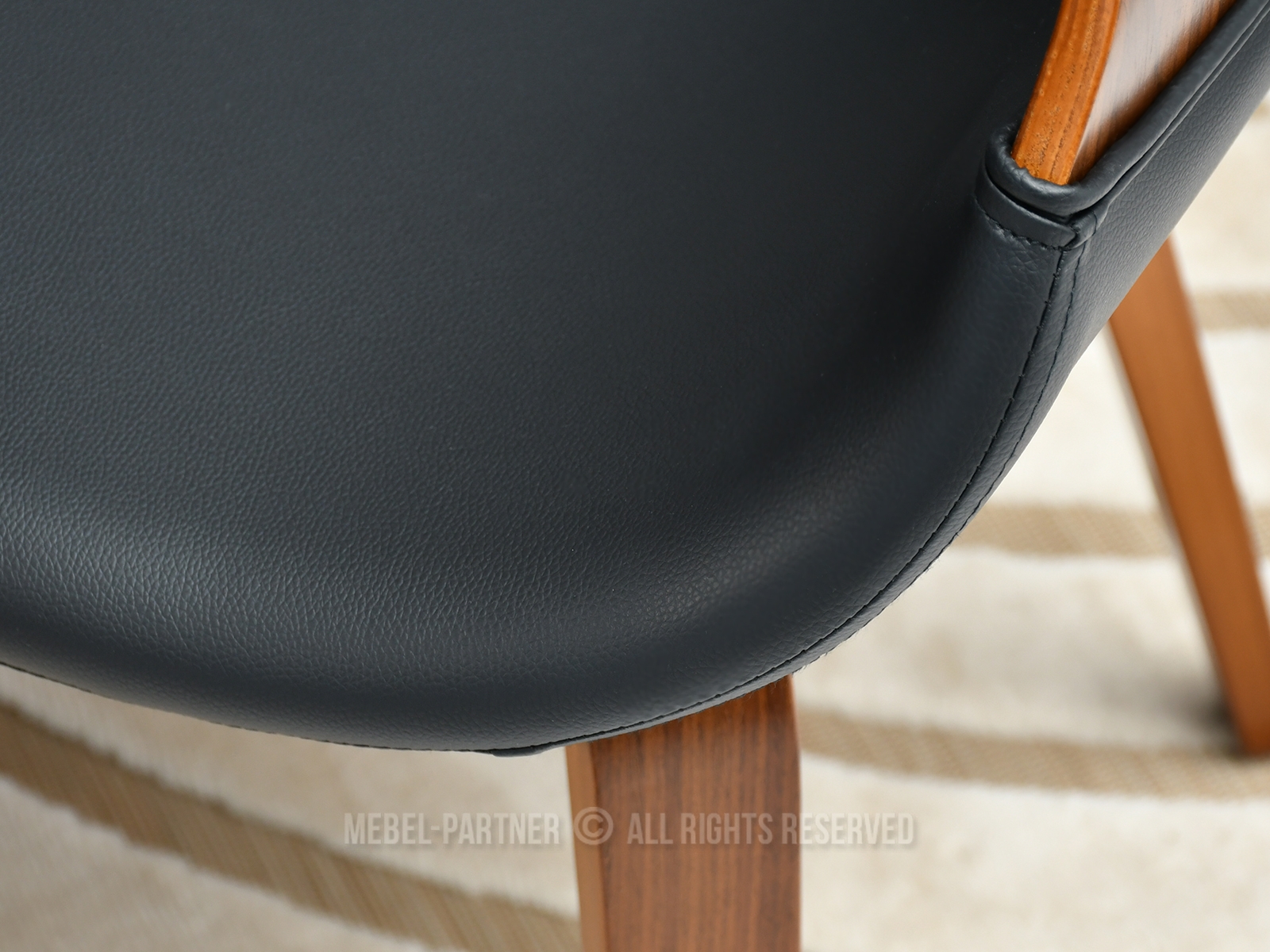 Scaunul Kurt este o piesă de mobilier ce combină armonios designul contemporan cu funcționalitatea practică. Realizat din lemn masiv de nuc, impresionează prin structura solidă și detaliile rafinate care evidențiază calitatea superioară a materialelor. Tapițeria neagră, din imitație piele, asigură confort sporit și întreținere ușoară, fiind ideală pentru a aduce un plus de stil unei sufragerii moderne, unui birou sau unui spațiu de lounge.