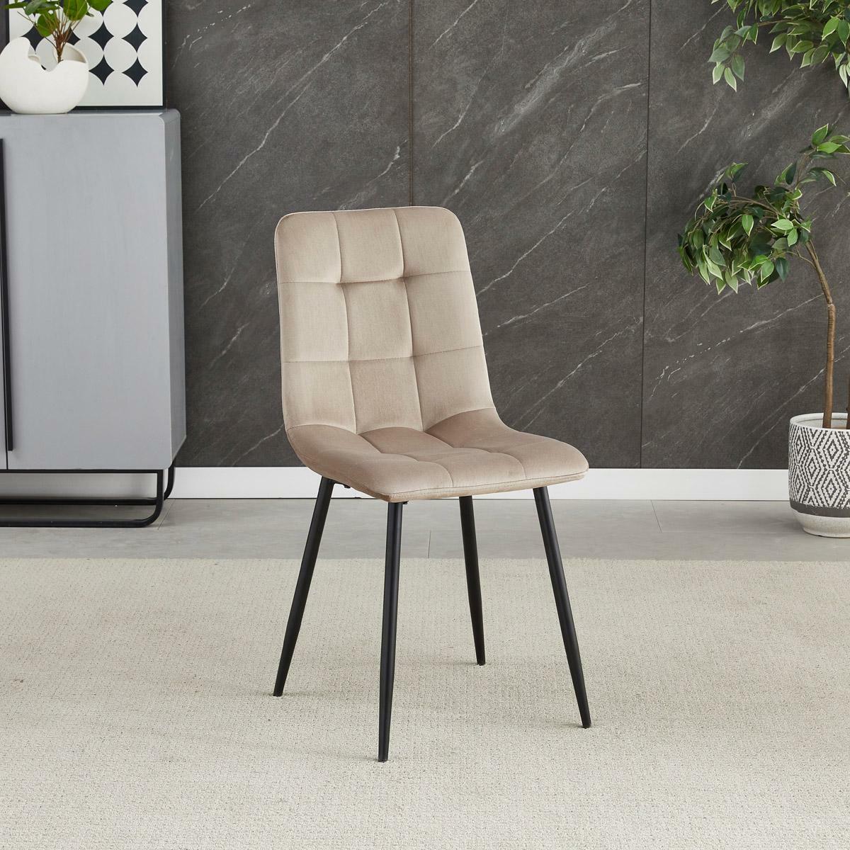 Scaunul de sufragerie Cereria, într-un rafinat crem închis, aduce un plus de confort și stil oricărui spațiu modern de dining. Tapițeria din catifea cu textură fină oferă o senzație plăcută la atingere, asigurând un confort sporit în timpul mesei, iar prelucrările elegante prin capitonare reflectă atenția la detalii și calitatea superioară a materialelor. Structura solidă cu picioare metalice negre conferă stabilitate și durabilitate, completând un design contemporan, perfect integrabil în ambienturi diverse, de la livinguri minimaliste și dininguri moderne, până la interioare în stil industrial sau scandinav.
