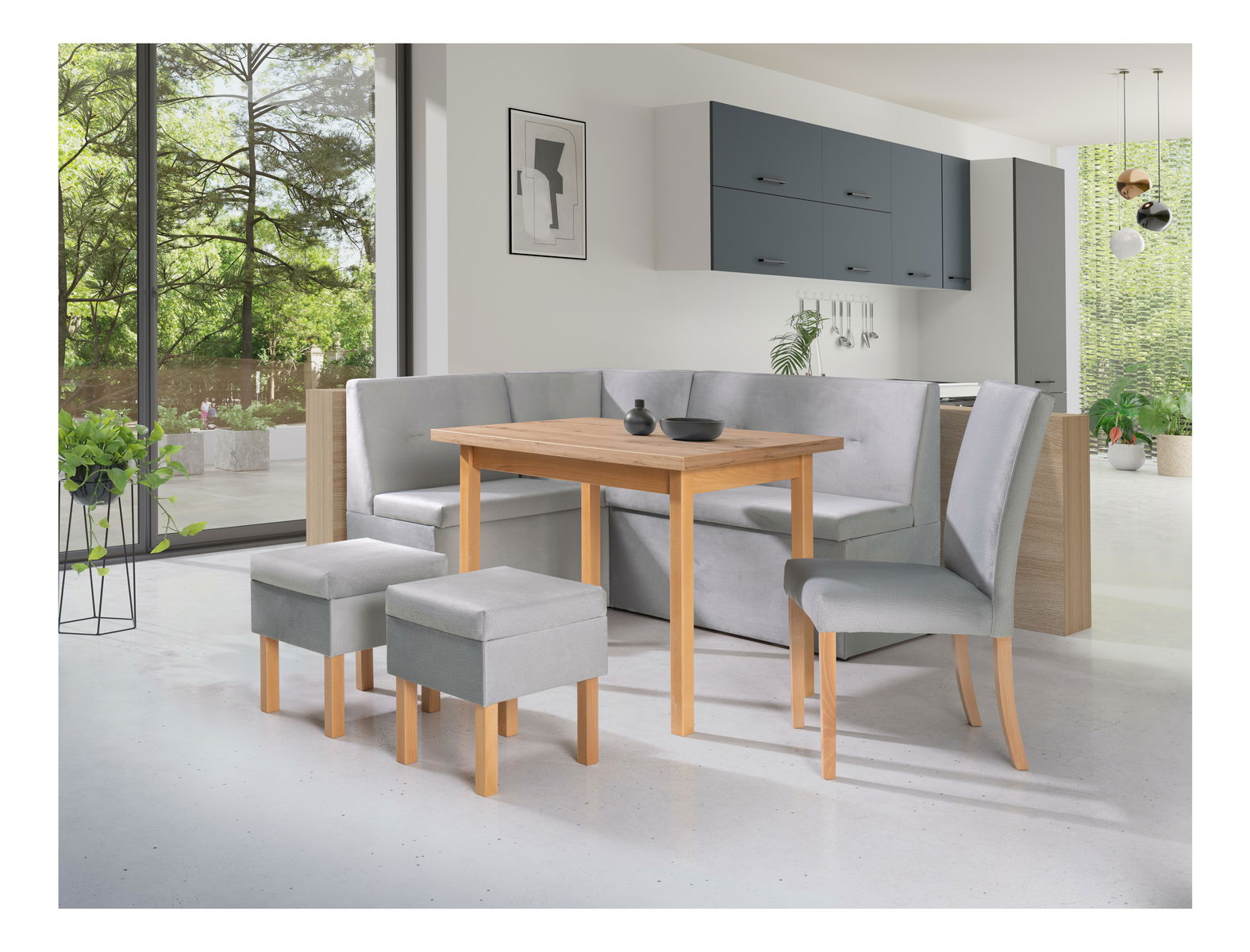 bancă de colț 130x170 cm, masă de sufragerie 110x70x78 cm, scaun 45x40x100 cm, 2x taburet 40x40x48 cm