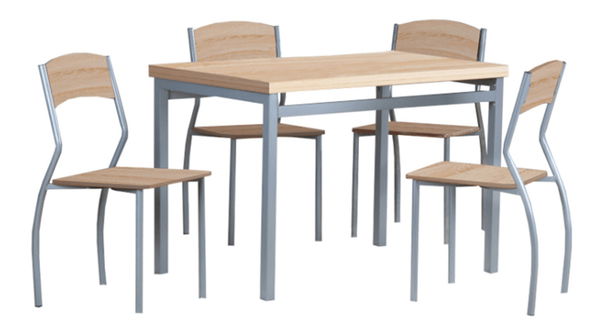 Set de sufragerie format dintr-o masă și patru scaune. Masa de sufragerie are picioare metalice mai groase și blatul pe versiunea color a stejarului sonoma. Versiunea color a șezutului și a spătarului este de stejar sonoma.