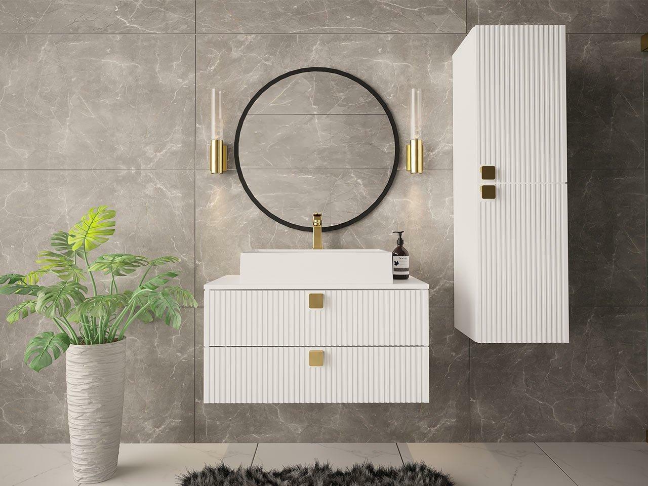 Reteta pentru un interior frumos si practic este mobilierul de baie Perfect pentru orice spatiu. Constituite din elemente de agățat, economisesc spațiu pe podea și fac curățarea zilnică o briză. La lista de elemente funcționale, putem adăuga rafturi și sertare clare, necesare pentru cosmetice și diverse accesorii Combinația de mânere de culoare aurie cu frezare decorativă pe față oferă un efect vizual uimitor. Dulapul suspendat și cel de sub chiuvetă au mult spațiu de depozitare. De asemenea, puteți cumpăra un sifon și o chiuvetă pentru set. Mobilierul de baie prezentat îți va schimba amenajarea și îi va conferi un caracter exclusivist.