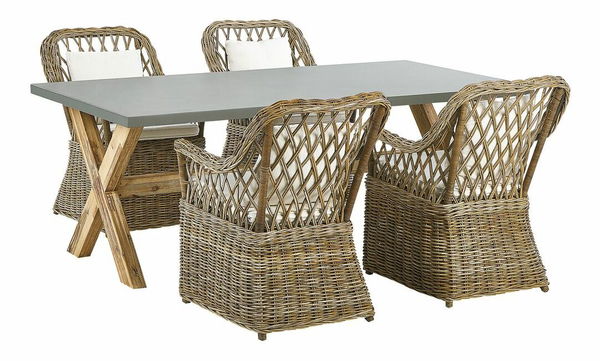 1 x masă, 4 x scaun, 4 x pernă pentru scaun, 4 x pernă pentru spătar
